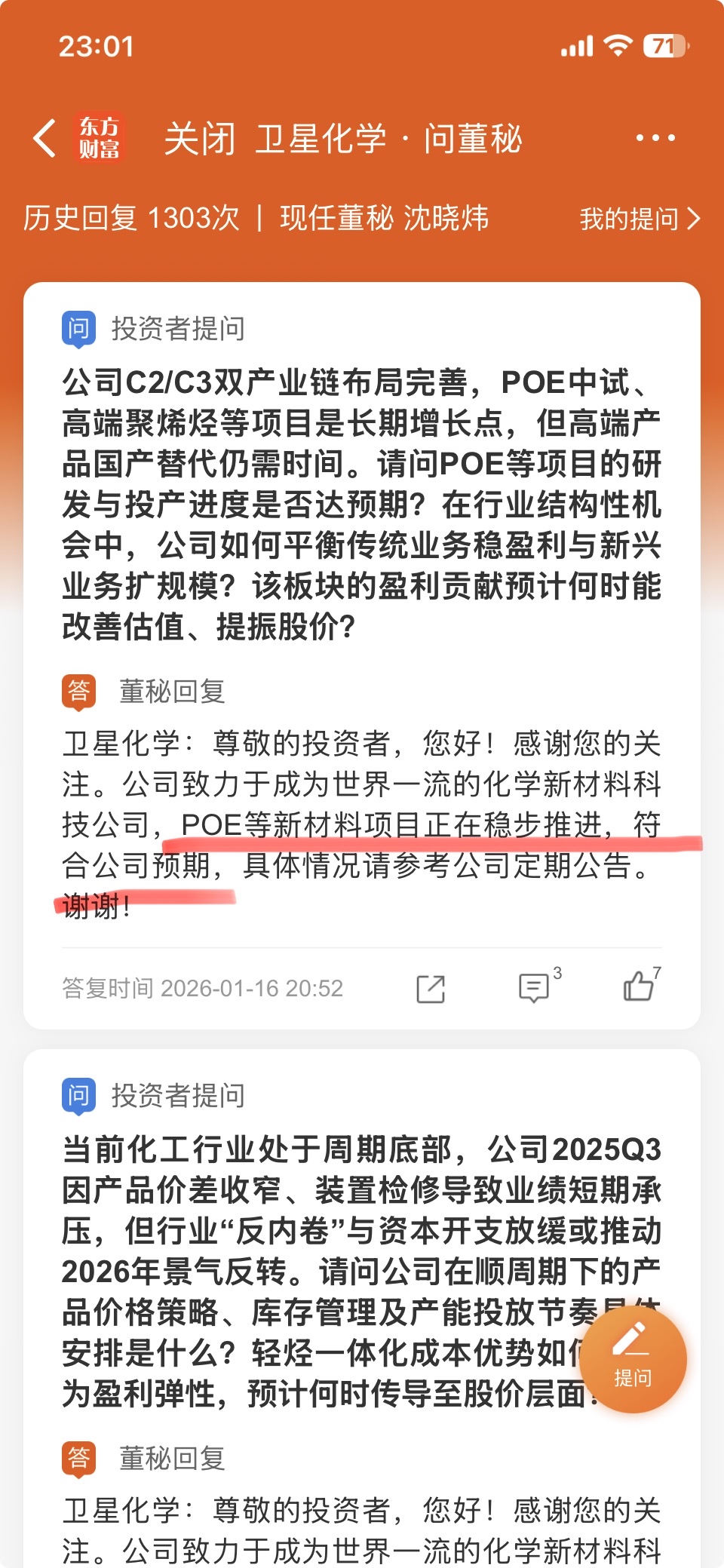 $卫星化学(SZ002648)$ POE等新材料项目正在稳步推进,符合公司预期。