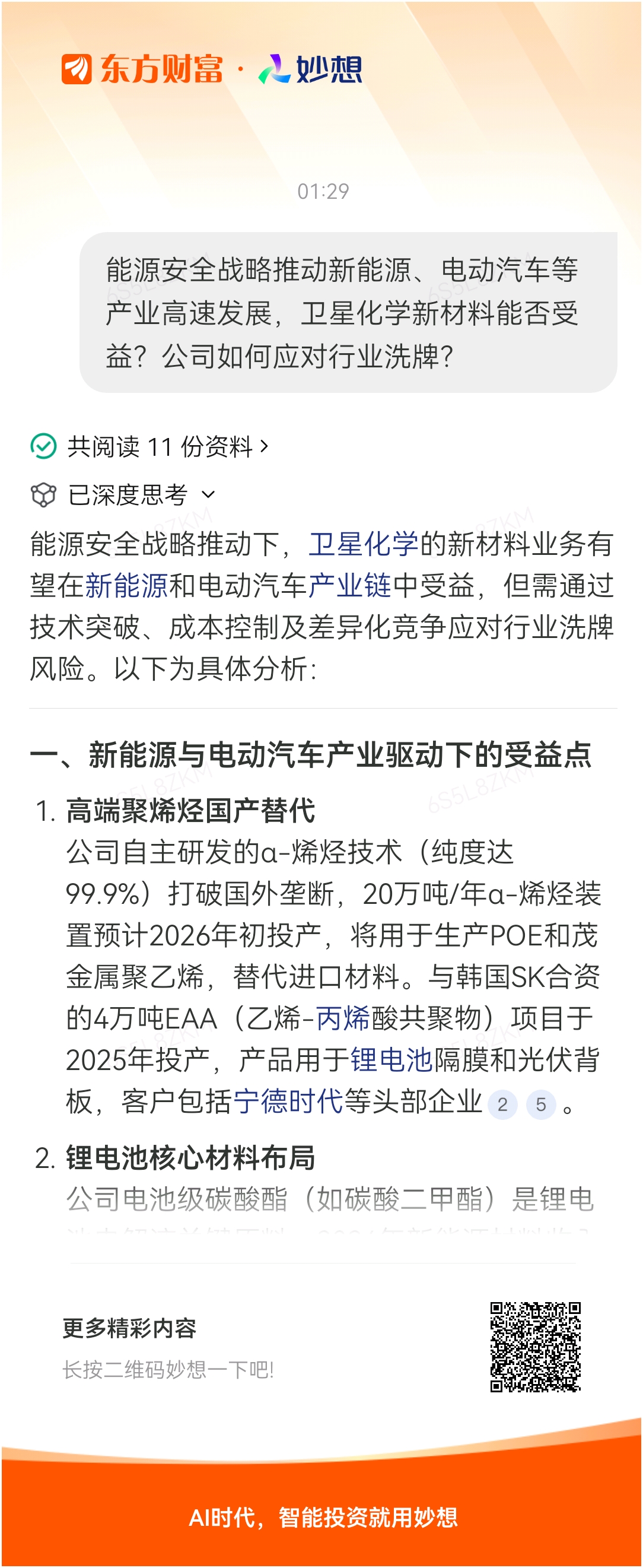 能源安全战略推动新能源、电动汽车等产业高速发展,卫星化学新材料能否受益?公司如何应对行业洗牌及技术迭代风险?$卫星化学(SZ002648)$