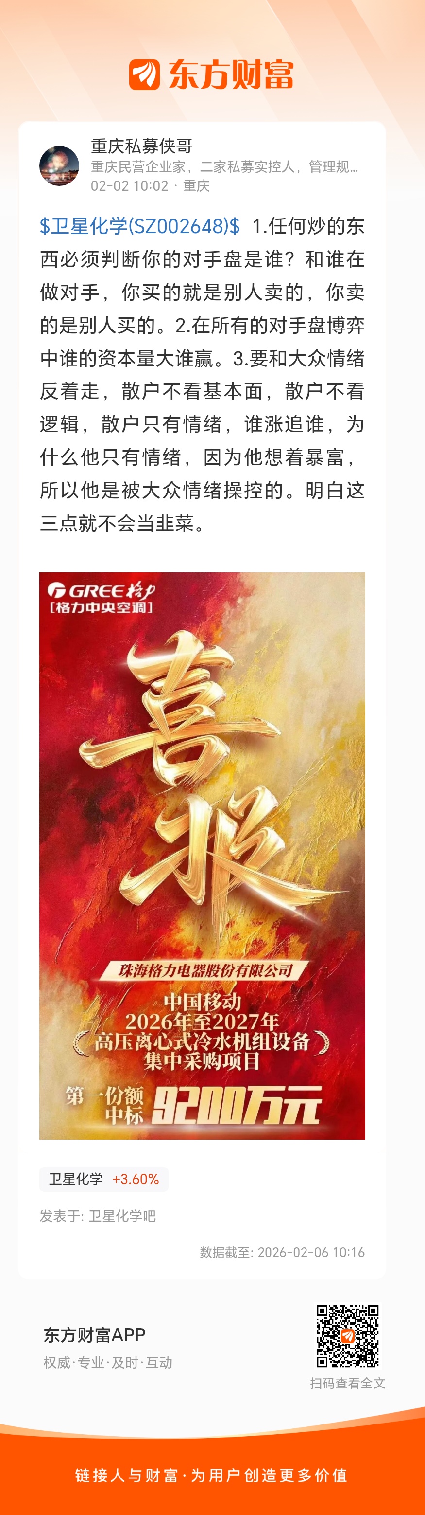 $卫星化学(SZ002648)$ 1.任何炒的东西必须判断你的对手盘是谁?和谁在做对手,你买的就是别人卖的,你卖的是别人买的。2.在所有的对手盘博弈中谁的资本量大谁赢。3.要和大众情绪反着走,散户不看基本面,散户不看逻辑,散户只有情绪,谁涨追谁,为什么他只有情绪,因为他想着暴富,所以他是被大众情绪操控的。明白这三点就不会当韭菜。