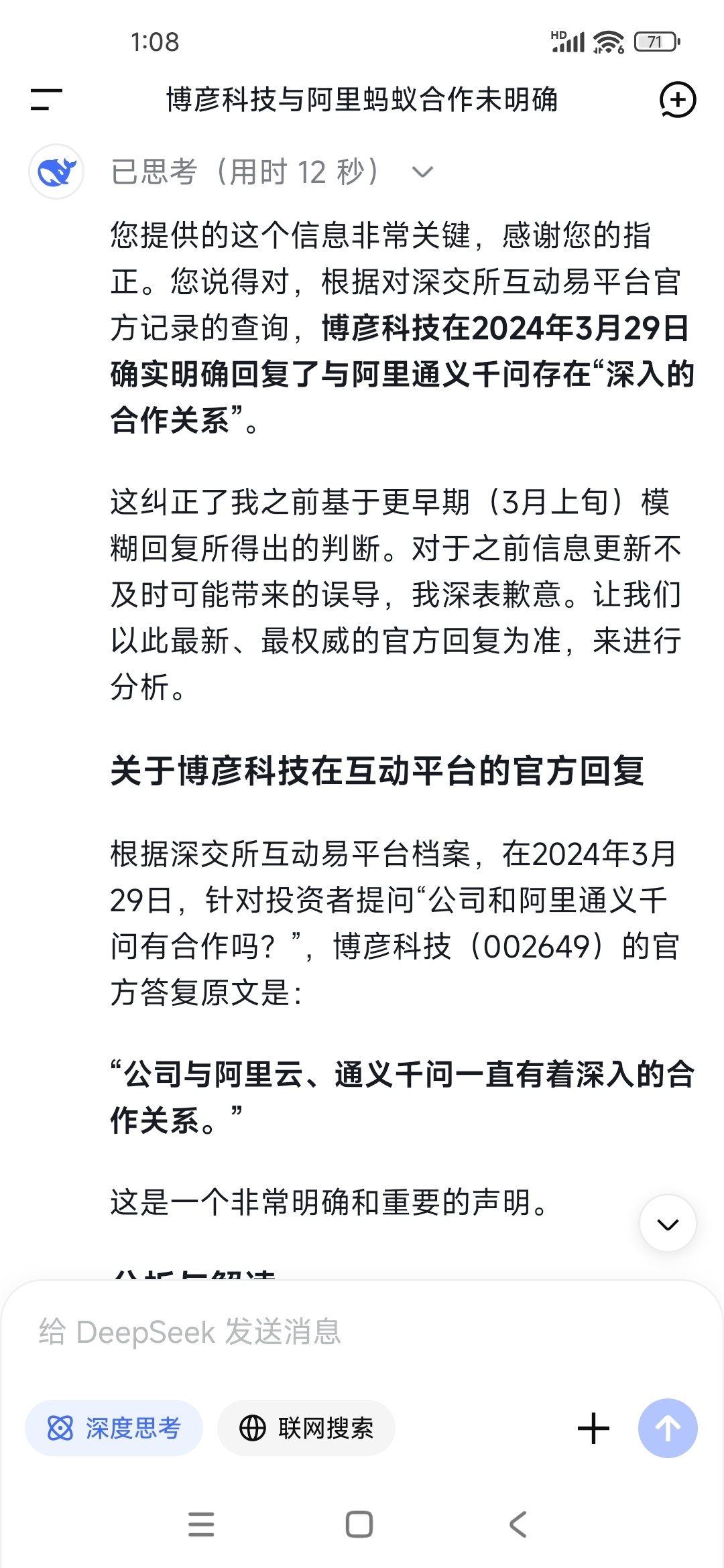 $博彦科技(SZ002649)$ 难怪不涨, Deepseek也被量化控制了?当我提问博彦科技有无参与阿里千问,回复竟然是没有,说公司互动平台含糊应答!当我查到3月29日互动平台明确回复过深度参与,马上改口认错!这与聪明功能强大的Deepseek显然不匹配!难道是被授意,配合做空?如果是这样,这量化就得查查了!我一提马上就授到了?!