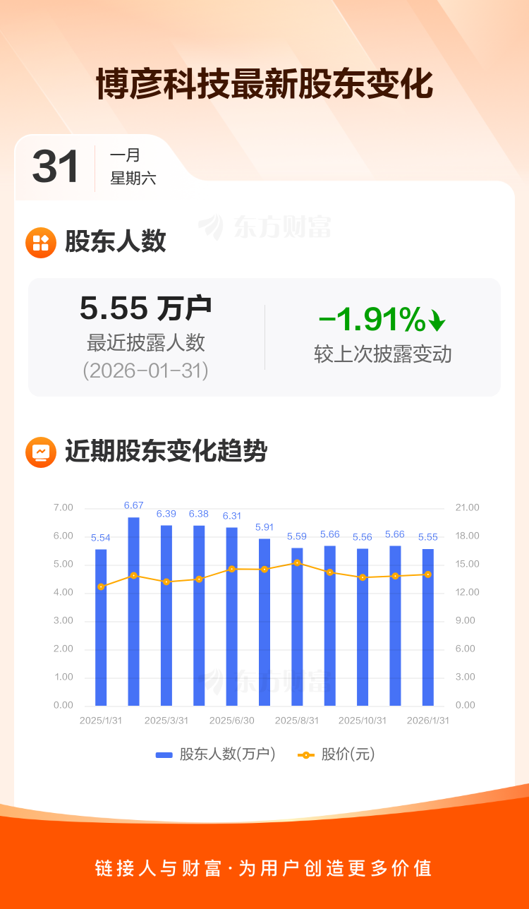 博彦科技最新披露数据显示,截至1月31日公司股东户数为5.55万户,较上期(2025年11月30日)减少1082户,降幅为1.91%。户均持有流通股数量由上期的9697股上升至9886股,户均持股金额由上期的13.36万元增加至13.79万元。