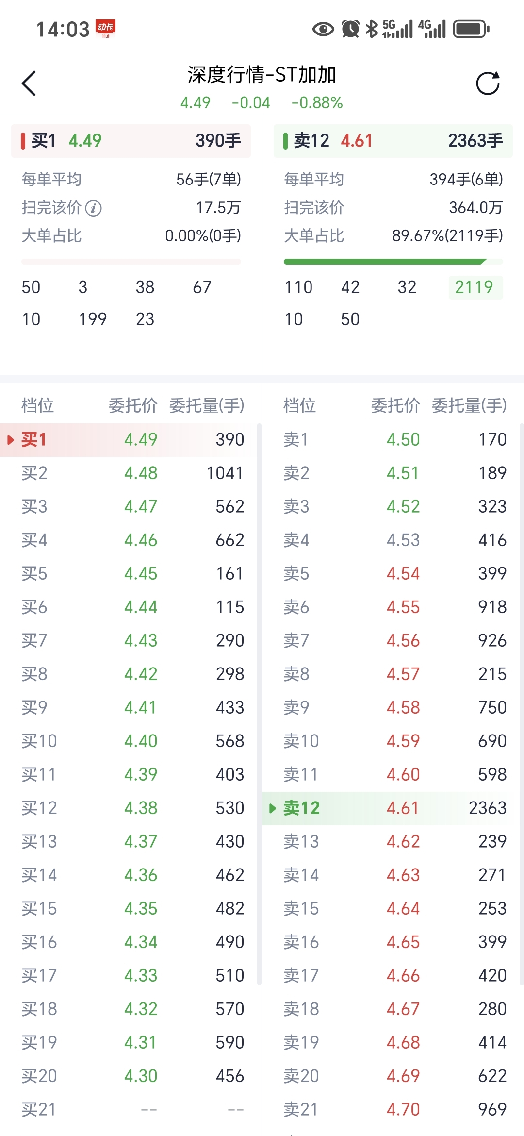 $ST加加(SZ002650)$ 全是散户买卖,4.61有2119手,吃掉它就可剑指涨停!不过呢,没消息,散户自己玩吧