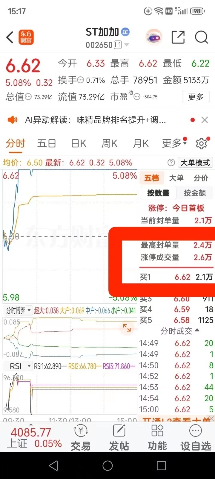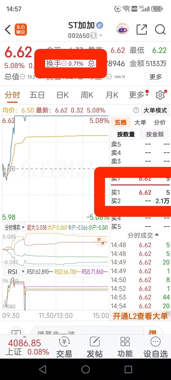 加加ST封单最高2.4万手尾盘尚有2.1万手严重惜售。换手率0.7%严重惜售!尾