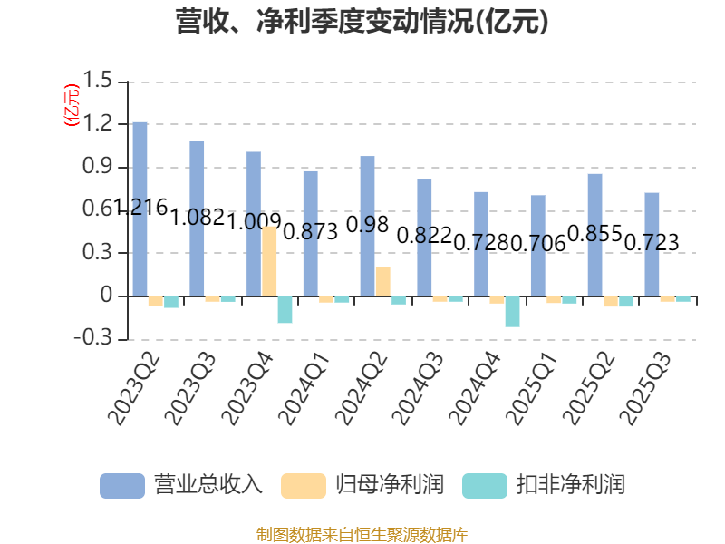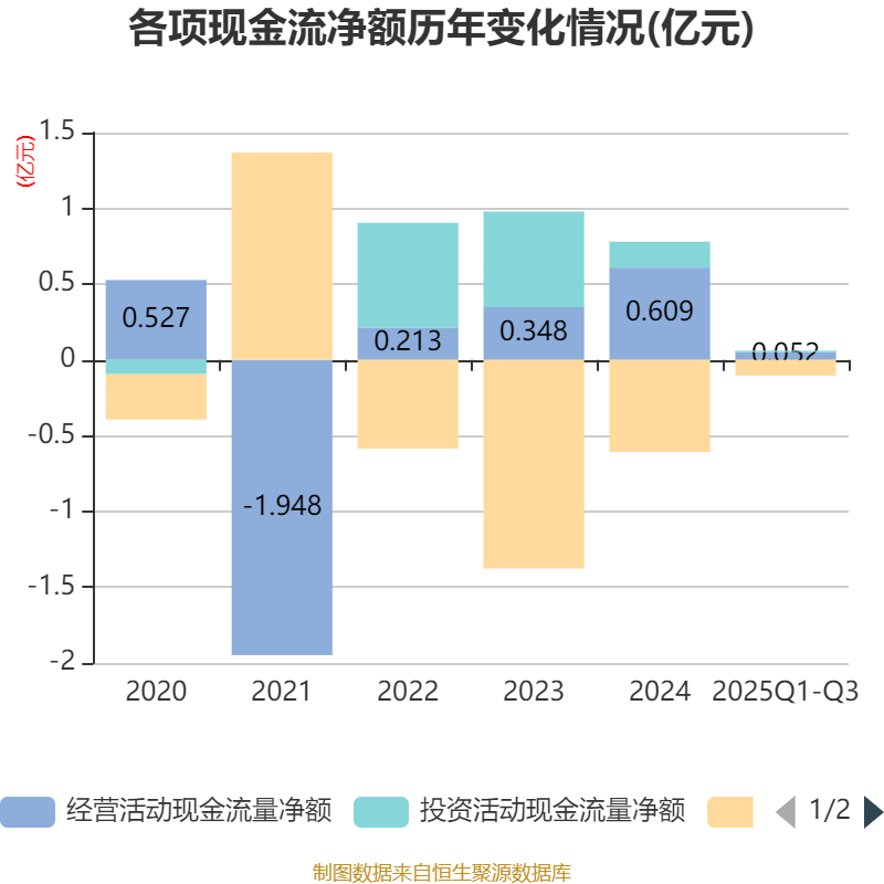 2025年前三季度,公司经营活动现金流净额为516.42万元,同比下降91.21%;筹资活动现金流净额-1030.2万元,同比增加4404.76万元;投资活动现金流净额93.71万元,上年同期为1502.74万元。