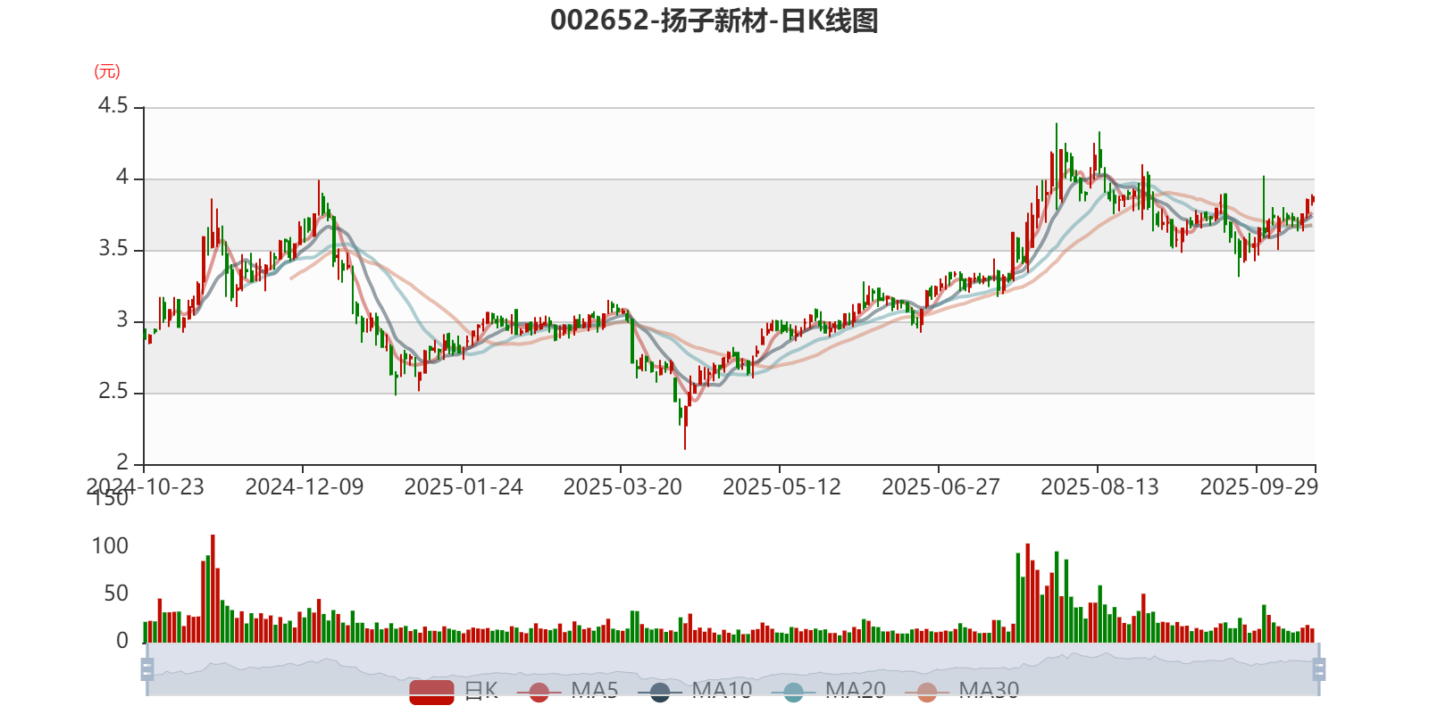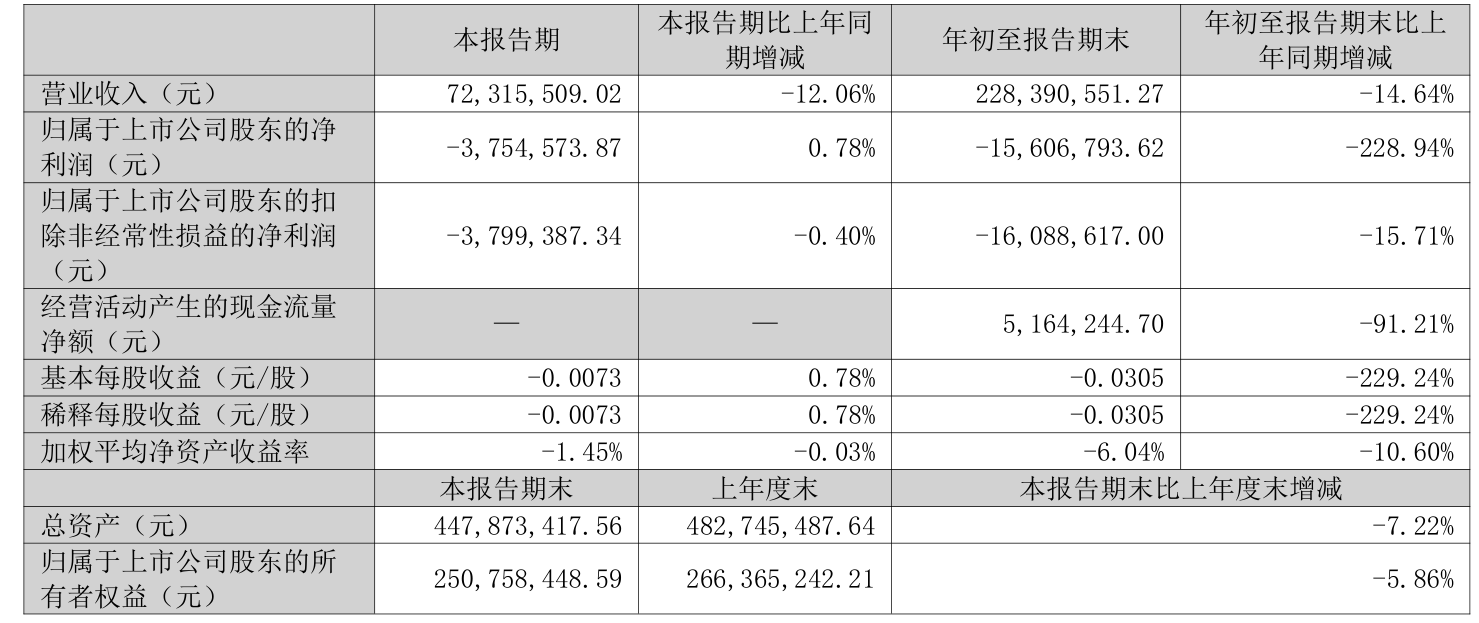 中证智能财讯扬子新材(002652)10月23日披露2025年第三季度报告。前三季度公司实现营业总收入2.28亿元,同比下降14.64%;归母净利润亏损1560.68万元,上年同期盈利1210.43万元;扣非净利润亏损1608.86万元,上年同期亏损1390.49万元;经营活动产生的现金流量净额为516.42万元,同比下降91.21%;报告期内,扬子新材基本每股收益为-0.0305元,加权平均净资产收益率为-6.04%。