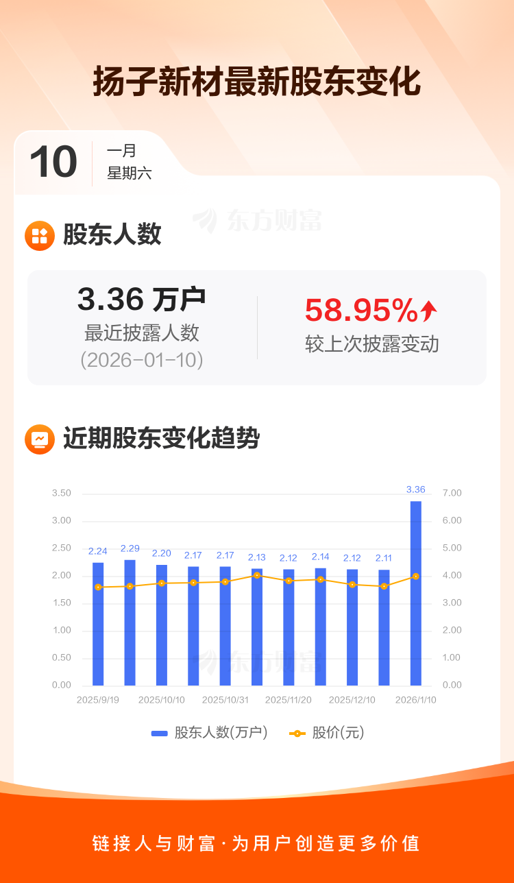 扬子新材:截至1月10日最新股东户数3.36万户,较上期增加58.95%