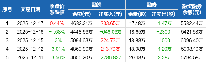 海思科融资融券信息显示,2025年12月17日融资净买入233.65万元;融资余额4682.21万元,较前一日增加5.25%。