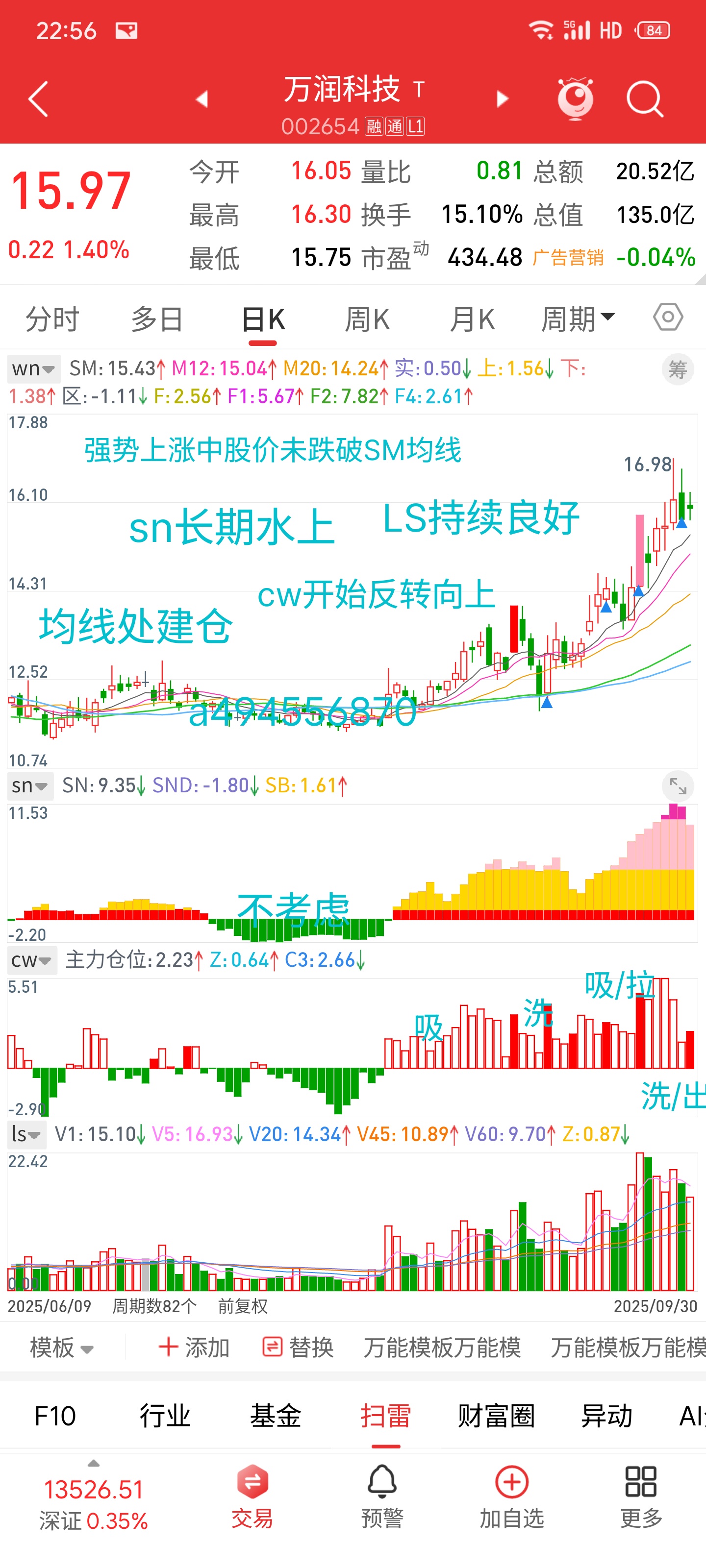 $万润科技(SZ002654)$ 股价长期未跌破SM,强势上涨中。注意成交量变化。