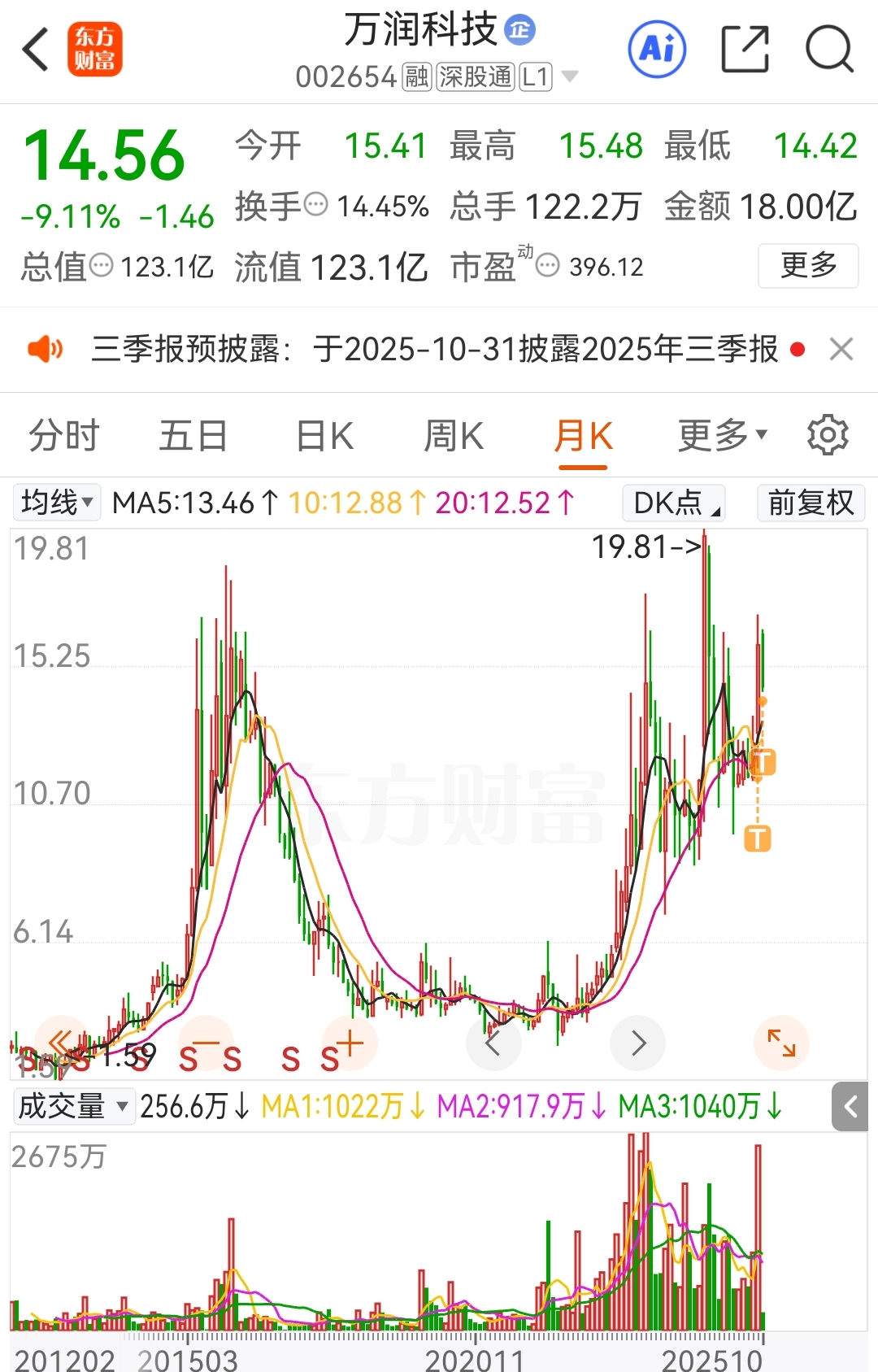 $万润科技(SZ002654)$ 逼近历史天量和历史高位,知道为啥跌了吧,已经涨过了