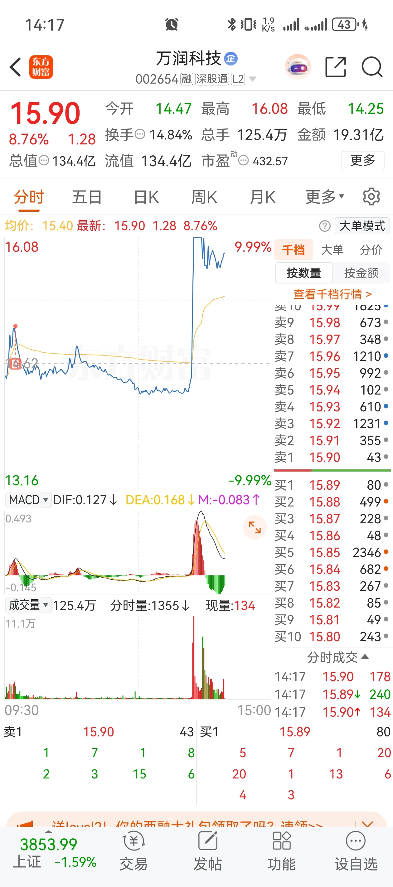 $万润科技(SZ002654)$ 早上高点打满,后面走的心都凉了。。。。下午突然好起来了