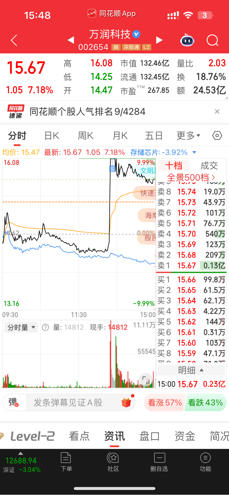 $万润科技(SZ002654)$ 我不贪后面封单撤掉了,估计又把家人们挂在山顶