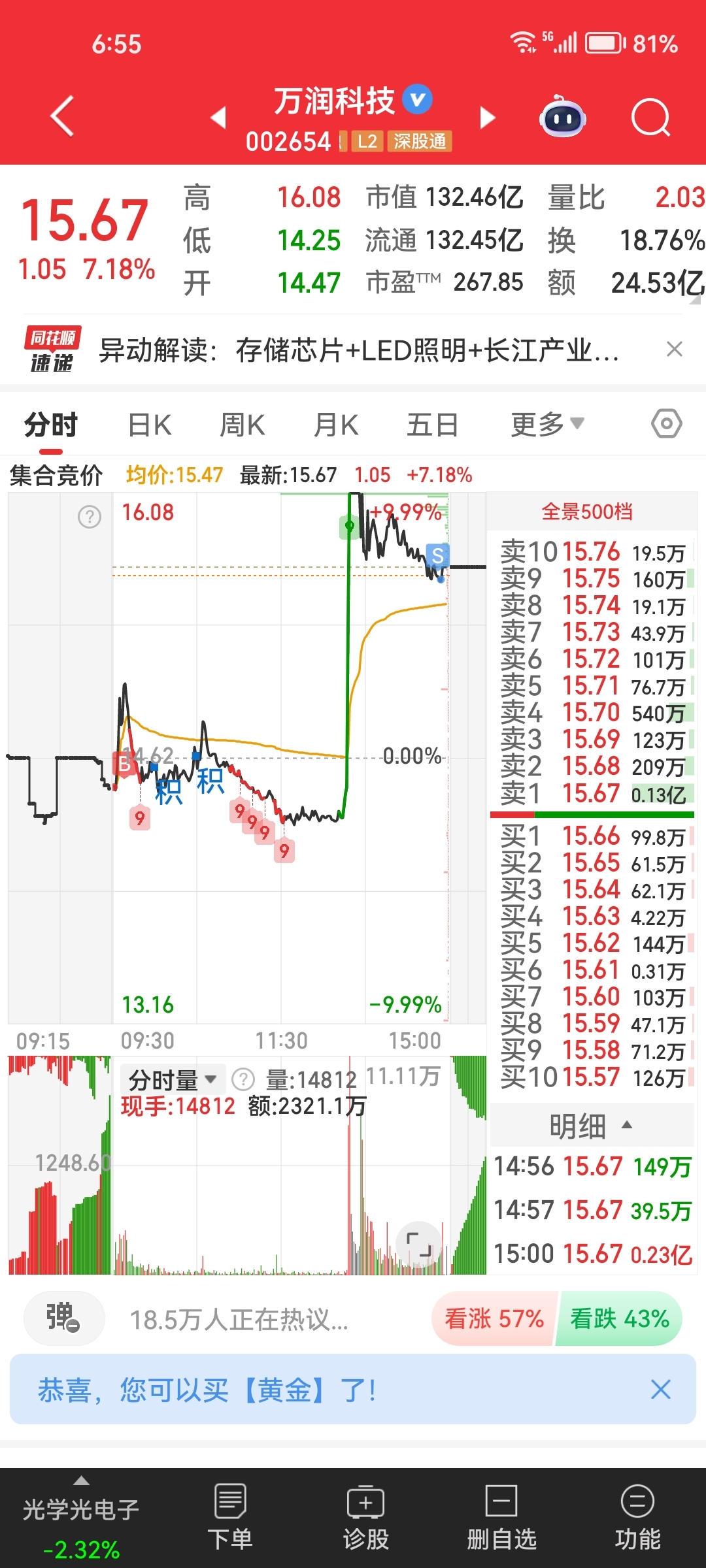 $万润科技(SZ002654)$ 只留了底仓,都卖了,炸板不回封,星期一低开概率超大