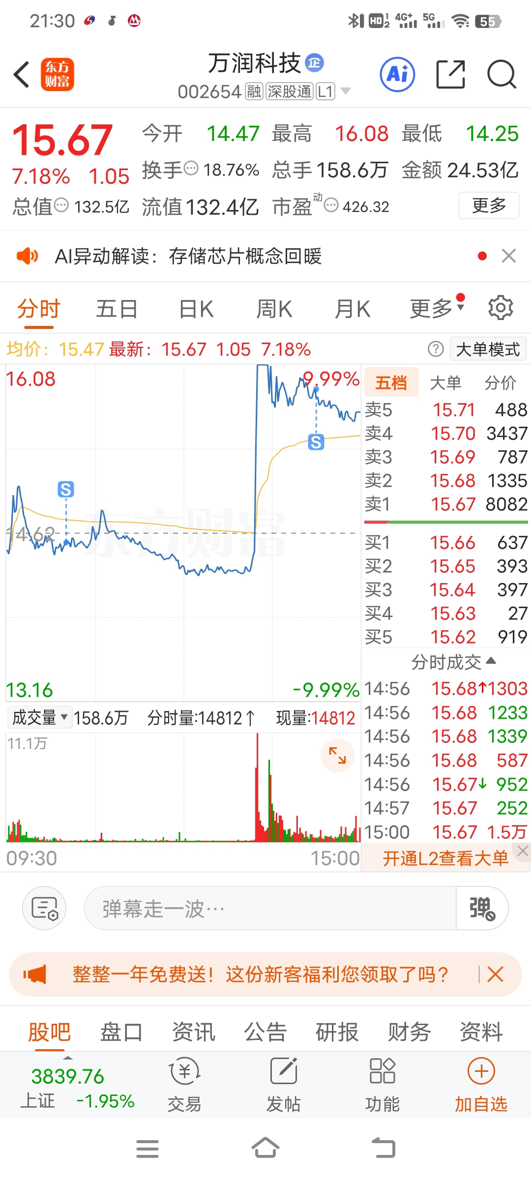 $万润科技(SZ002654)$ 今天大盘下挫,所以开盘就卖了一大半,虽然今天卖飞了,但是也是计划内的操作,尾盘把底仓也卖了,平出,没亏也没赚,主要其他个股拖累,为了减少个股持仓数量,所以卖出了,要优化自己的持仓结构,提高审美。