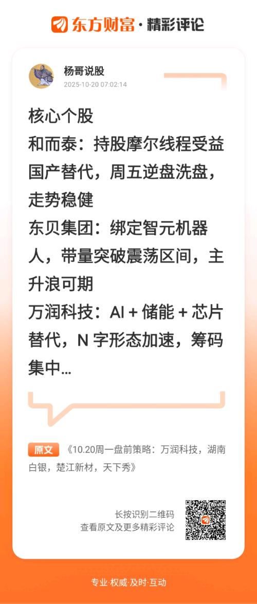 感谢分析,分析的不错//@杨哥说股 核心个股和而泰:持股摩尔线程受益国产替代,周五逆盘洗盘,走势稳健东贝集团:绑定智元机器人,带量突破震荡区间,主升浪可期$万润科技(SZ002654)$:AI + 储能 + 芯片替代,N 字形态加速,筹码集中合肥城建:连板强势,下周谨慎逢高出货指数与盘面指数:3800 点成关键支撑,成交量萎缩预示底部蓄力,三季报业绩成核心主线板块:贵金属持续性存疑,业绩超预期个股(消费 / 医药 / 新能源等)受关注持仓策略持有:天下秀(企稳 5 日线)、赛力斯(观望 153 支撑位)、$楚江新材(SZ002171)$(洗盘后待回暖)、$湖南白银(SZ002716)$(贵金属趋势向好)出货:合肥城建(谨慎逢高)
