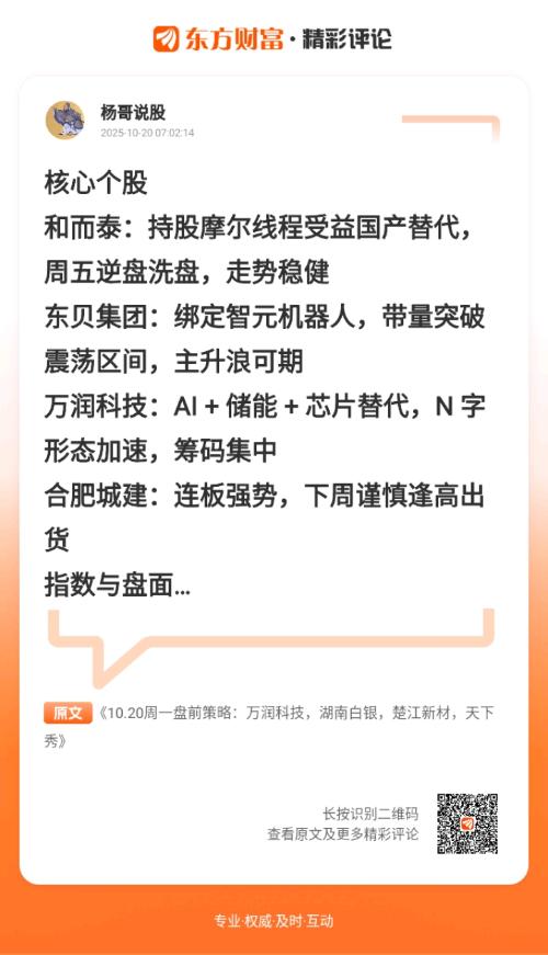老师分析一步到位//@杨哥说股 :核心个股和而泰:持股摩尔线程受益国产替代,周五逆盘洗盘,走势稳健东贝集团:绑定智元机器人,带量突破震荡区间,主升浪可期$万润科技(SZ002654)$:AI + 储能 + 芯片替代,N 字形态加速,筹码集中合肥城建:连板强势,下周谨慎逢高出货指数与盘面指数:3800 点成关键支撑,成交量萎缩预示底部蓄力,三季报业绩成核心主线板块:贵金属持续性存疑,业绩超预期个股(消费 / 医药 / 新能源等)受关注持仓策略持有:天下秀(企稳 5 日线)、赛力斯(观望 153 支撑位)、$楚江新材(SZ002171)$(洗盘后待回暖)、$湖南白银(SZ002716)$(贵金属趋势向好)出货:合肥城建(谨慎逢高)