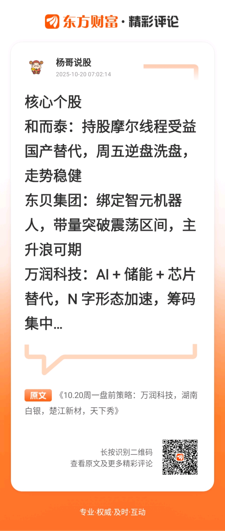 //@杨哥说股 :核心个股和而泰:持股摩尔线程受益国产替代,周五逆盘洗盘,走势稳健东贝集团:绑定智元机器人,带量突破震荡区间,主升浪可期$万润科技(SZ002654)$:AI + 储能 + 芯片替代,N 字形态加速,筹码集中合肥城建:连板强势,下周谨慎逢高出货指数与盘面指数:3800 点成关键支撑,成交量萎缩预示底部蓄力,三季报业绩成核心主线板块:贵金属持续性存疑,业绩超预期个股(消费 / 医药 / 新能源等)受关注持仓策略持有:天下秀(企稳 5 日线)、赛力斯(观望 153 支撑位)、$楚江新材(SZ002171)$(洗盘后待回暖)、$湖南白银(SZ002716)$(贵金属趋势向好)出货:合肥城建(谨慎逢高)