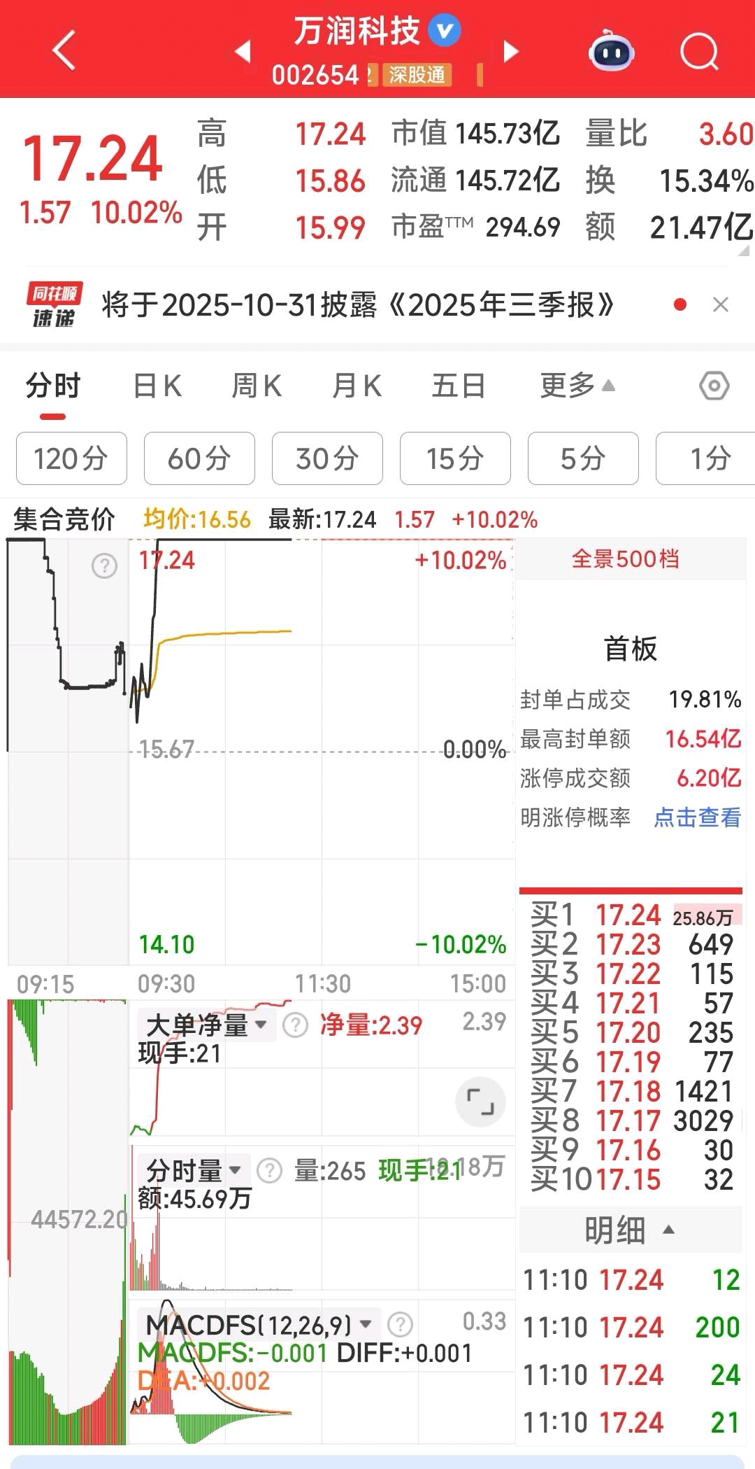 周五的尾盘干的万润科技,今天涨停了。吃肉了,自由发挥。我是静卧。