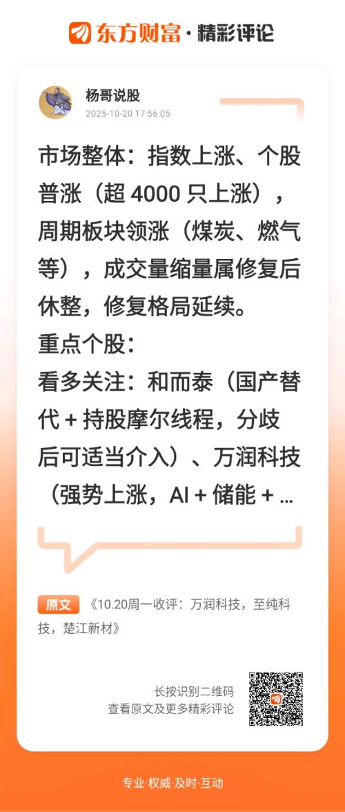 今日A股市场呈现出指数上涨、个股普涨的良好局面,三大指数均有不同程度的涨幅,全市场超4000只个股上涨,这充分说明了市场修复的广度和深度。成交量的缩量,更多的是市场在连续修复后的一种自我调节和休整,是为了消化前期的获利盘,并为后续的行情发展打下更坚实的基础,只要这种普涨的格局能够维持,市场的修复进程就不会中断。