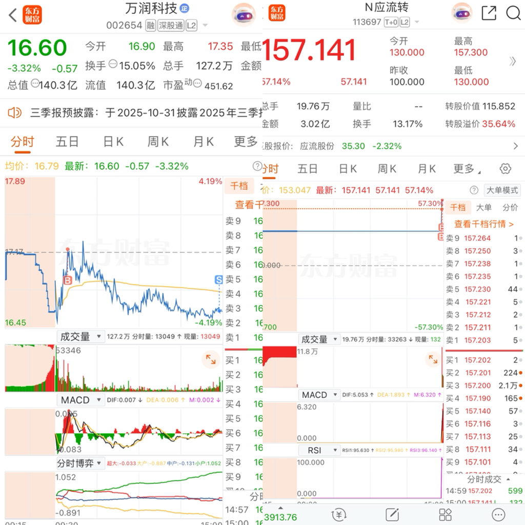$万润科技(SZ002654)$ 一格局就亏,还好转债逆势暴涨回血,明天看情况把转债卖了继续万润。