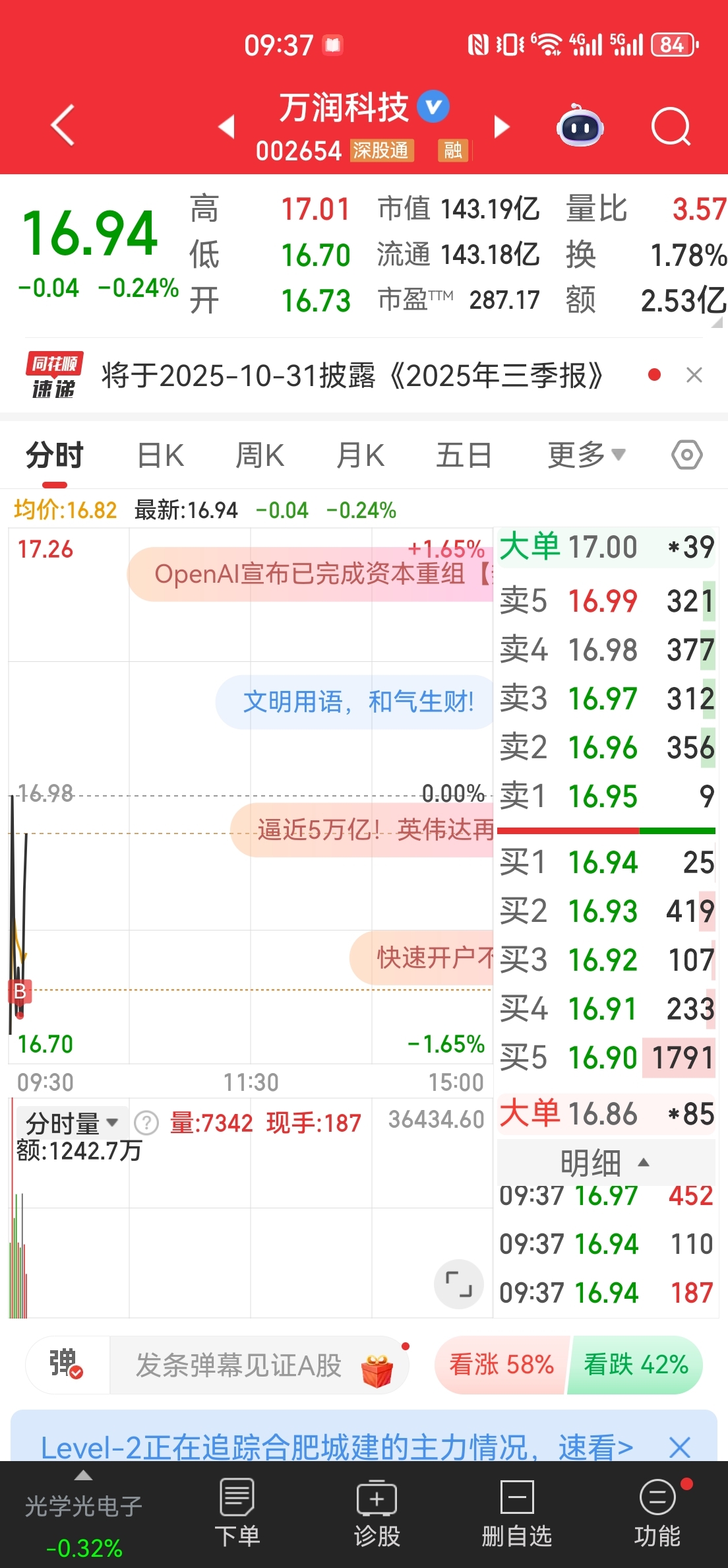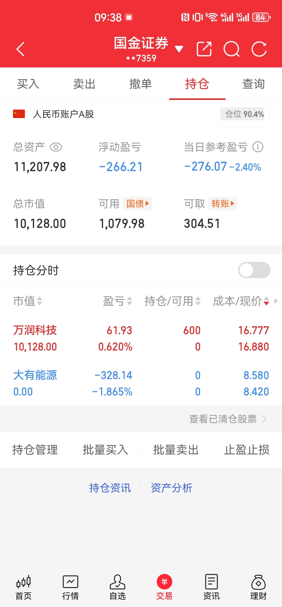 一万到一百万第七天,昨天买的大有开盘-3割了,-1.5买入万润科技。