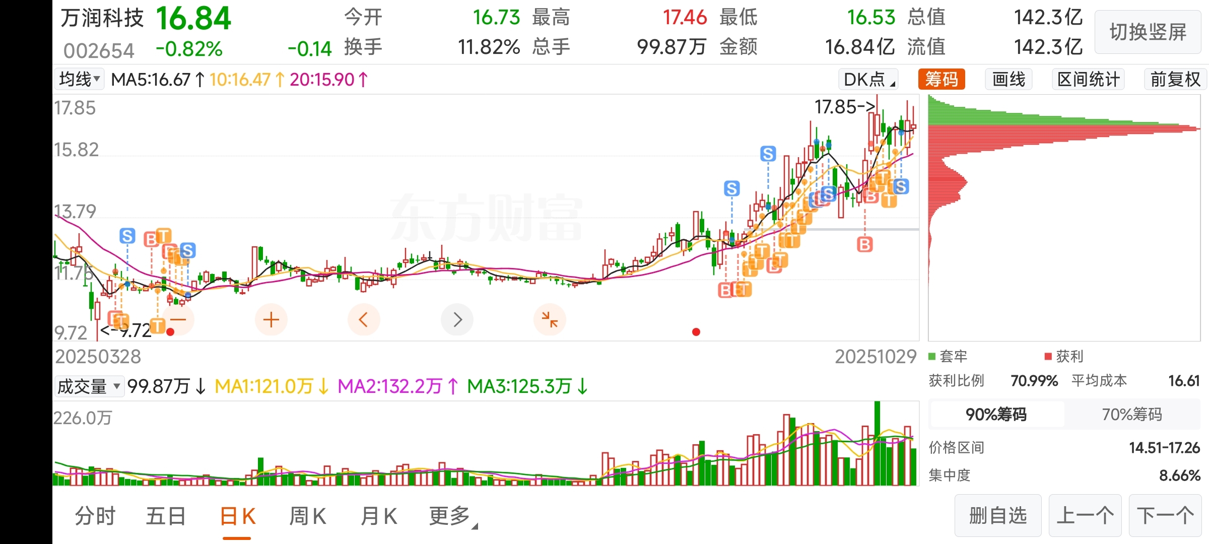 $万润科技(SZ002654)$ 各位,听我一句劝,改放手了。高位连续2天冲高回落,而且量又不少。行成顶部横盘。要突破早就突破了,关键底部筹码,这几天松动很厉害。只要板块回调,他必定下来。好票多的是,不要在一棵树上吊死了去。