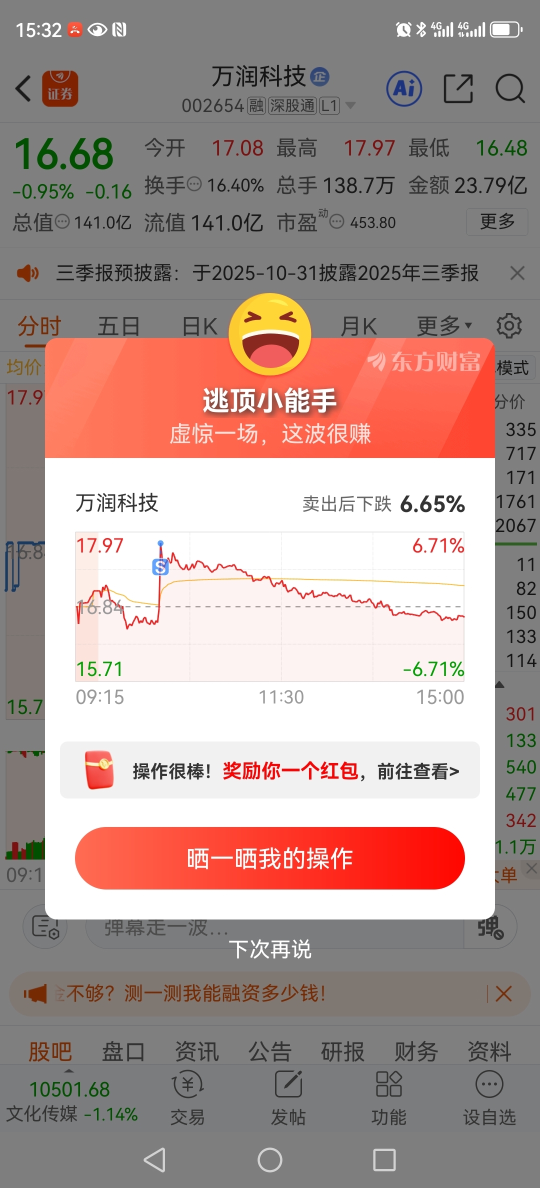 $万润科技(SZ002654)$ 这个点位卖的,还行吧?有高手可以交流一下#收盘点评# #复盘记录#