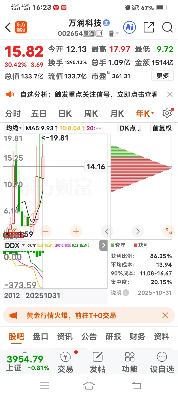 $万润科技(SZ002654)$ 看年线平均成本,13.94/.14块以下可以抄底博反弹了