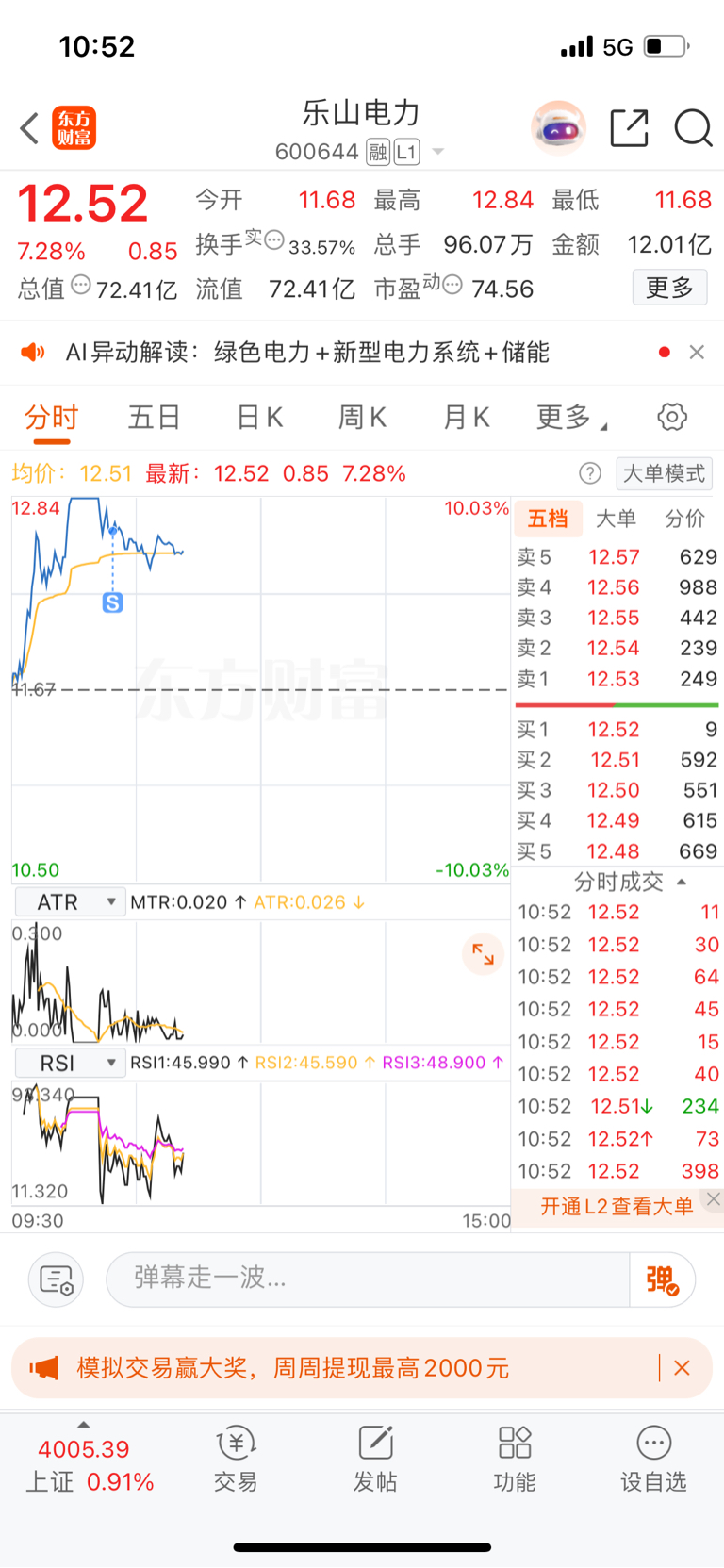 东方财富真是我的幸运AppT1超短线早盘高位卖出乐山电力,赚8.2个点!早盘买入