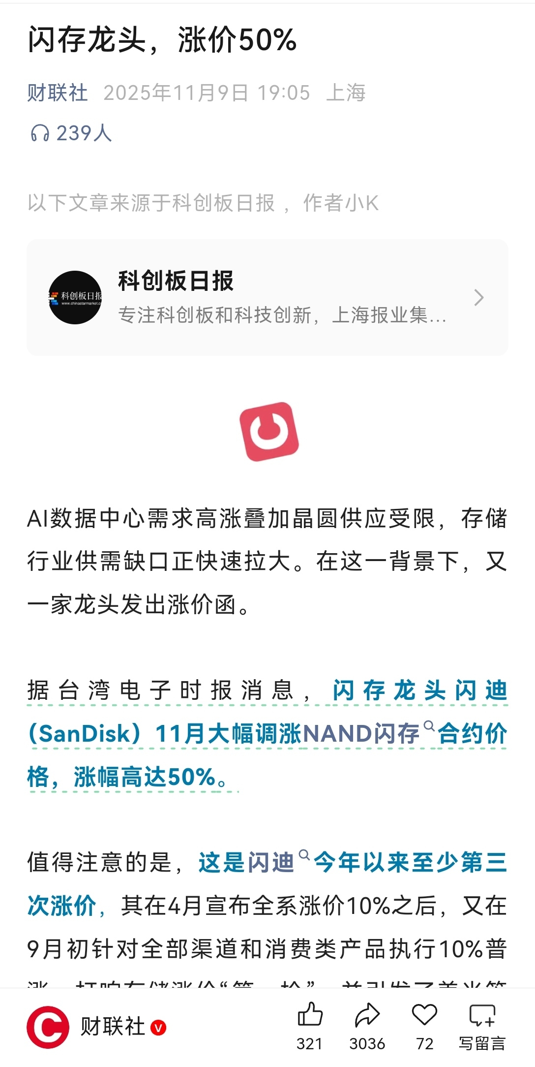 $万润科技(SZ002654)$ 闪存龙头,涨价50%