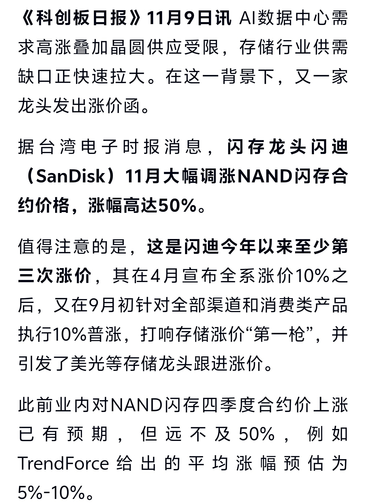 存储涨价继续,逻辑无法证伪需求推动价格!