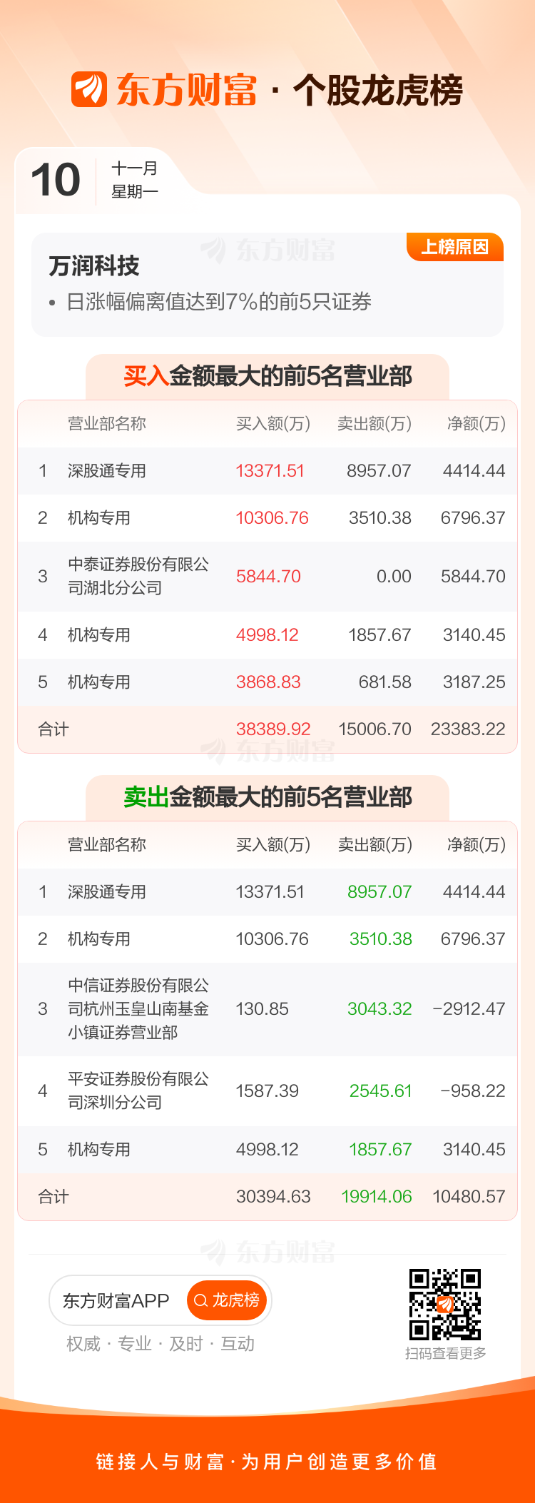 交易所2025年11月10日公布的交易公开信息显示,万润科技因成为日涨幅偏离值达到7%的前5只证券上榜。万润科技当日收报17.16元,涨跌幅10.00%,偏离值9.60%,换手率18.51%,成交额26.04亿。