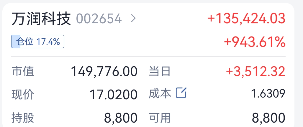 $万润科技(SZ002654)$ 反复做T成本非常低了 反正我已经锁仓,坚定等待万润股价翻倍。