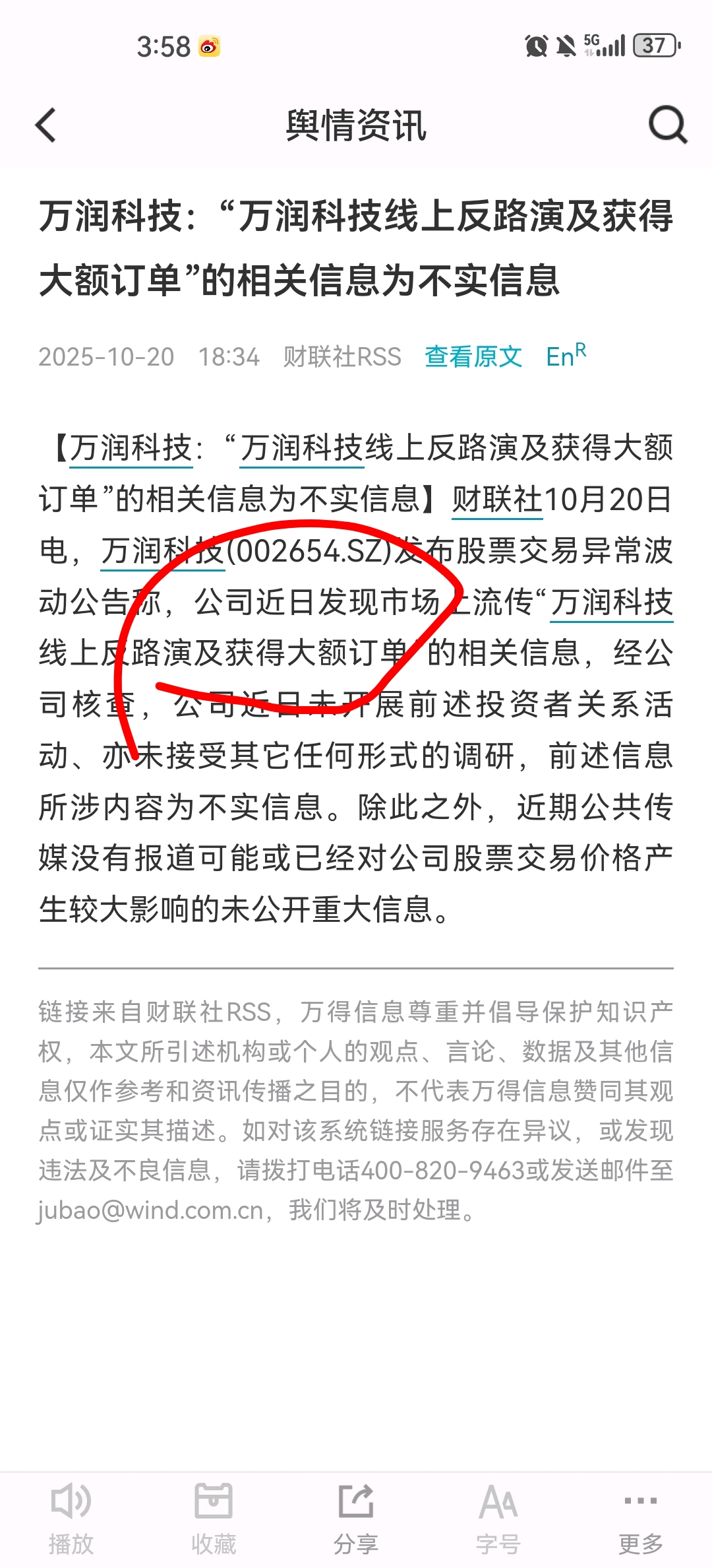 $万润科技(SZ002654)$ 这次辟谣,市场传言没有有任何媒体报道,都是帖子小作文,董秘是在哪里看到传言?散户帖子也要回应?董秘主动辟谣不正常的,不排除董秘配合资金打压,完全可以举报。