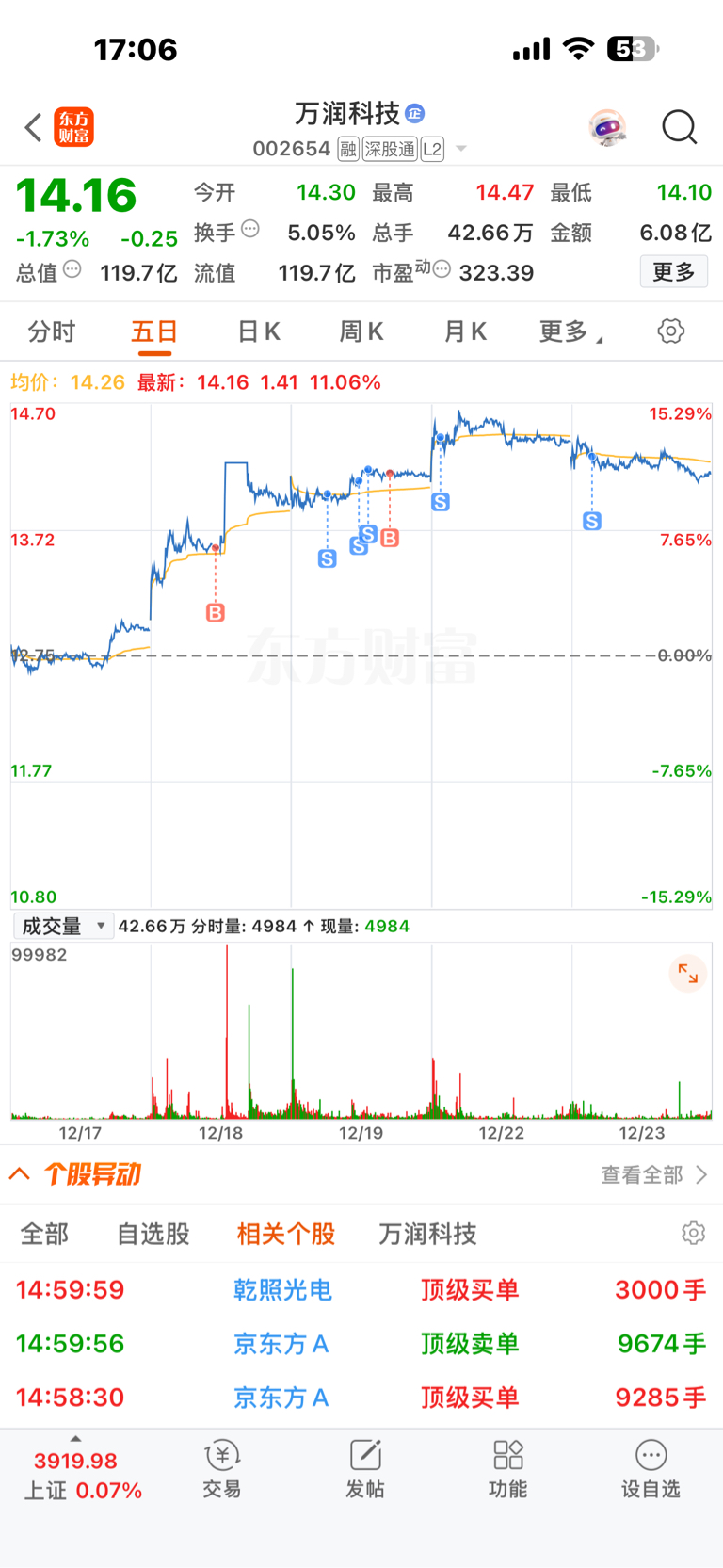 $万润科技(SZ002654)$ 买的不多跑了,赚个生活费