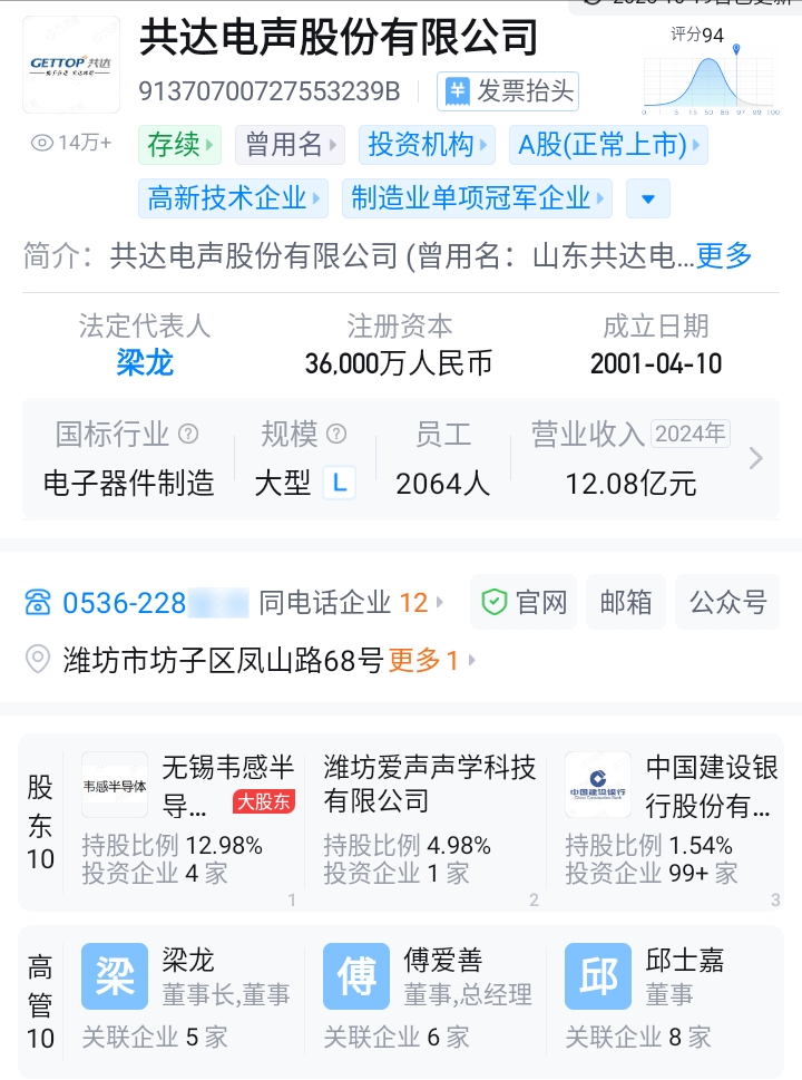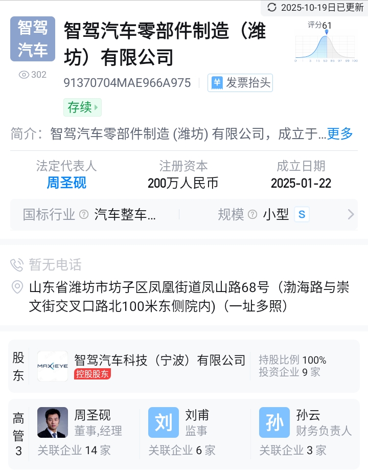 $共达电声(SZ002655)$ 共达电声即将并购整合智驾汽车科技(宁波)有限公司,智驾汽车科技(宁波)有限公司旗下全资公司智驾汽车零部件制造(潍坊)有限公司已进驻共达电声总部,双方注册地址都是注册地址山东省潍坊市坊子区凤山路68号。
