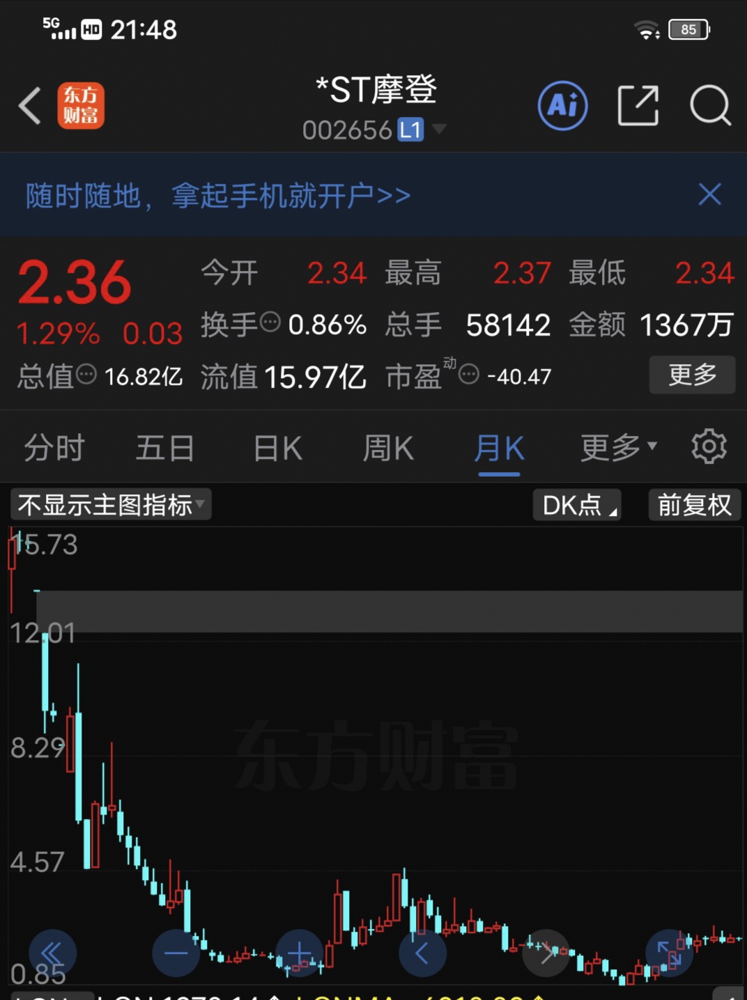 $*ST摩登(SZ002656)$ 死货,真的是没有主力,从15.73元跌到2.55元,回光返照也没有一个,解套根本就没有可能的$ST华通(SZ002602)$ $*ST宇顺(SZ002289)$