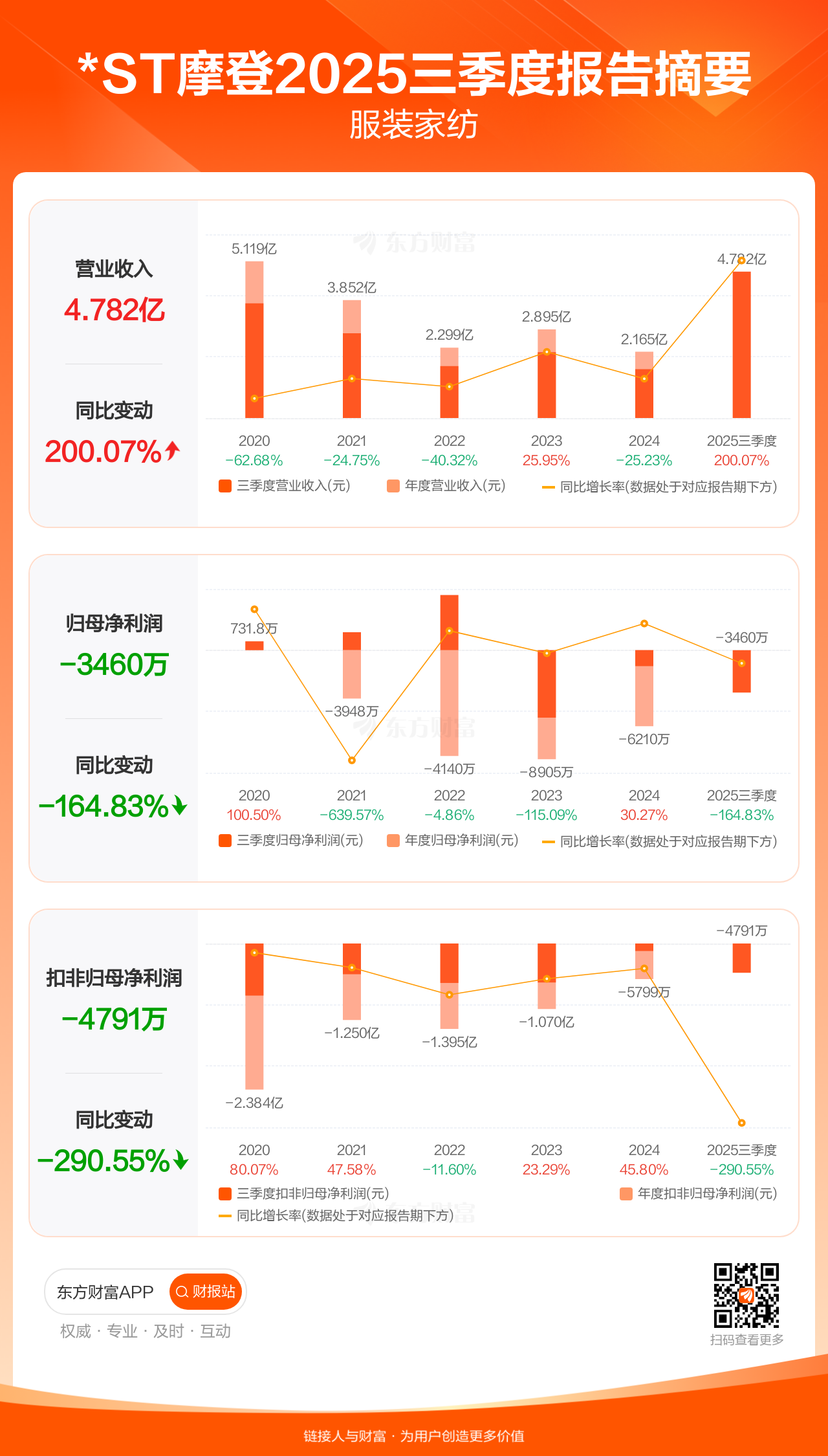 *ST摩登10月30日发布2025年三季报显示,公司前三季实现营业收入4.78亿元,同比增长200.07%;归母净利润-3459.86万元;扣非归母净利润-4791.15万元。