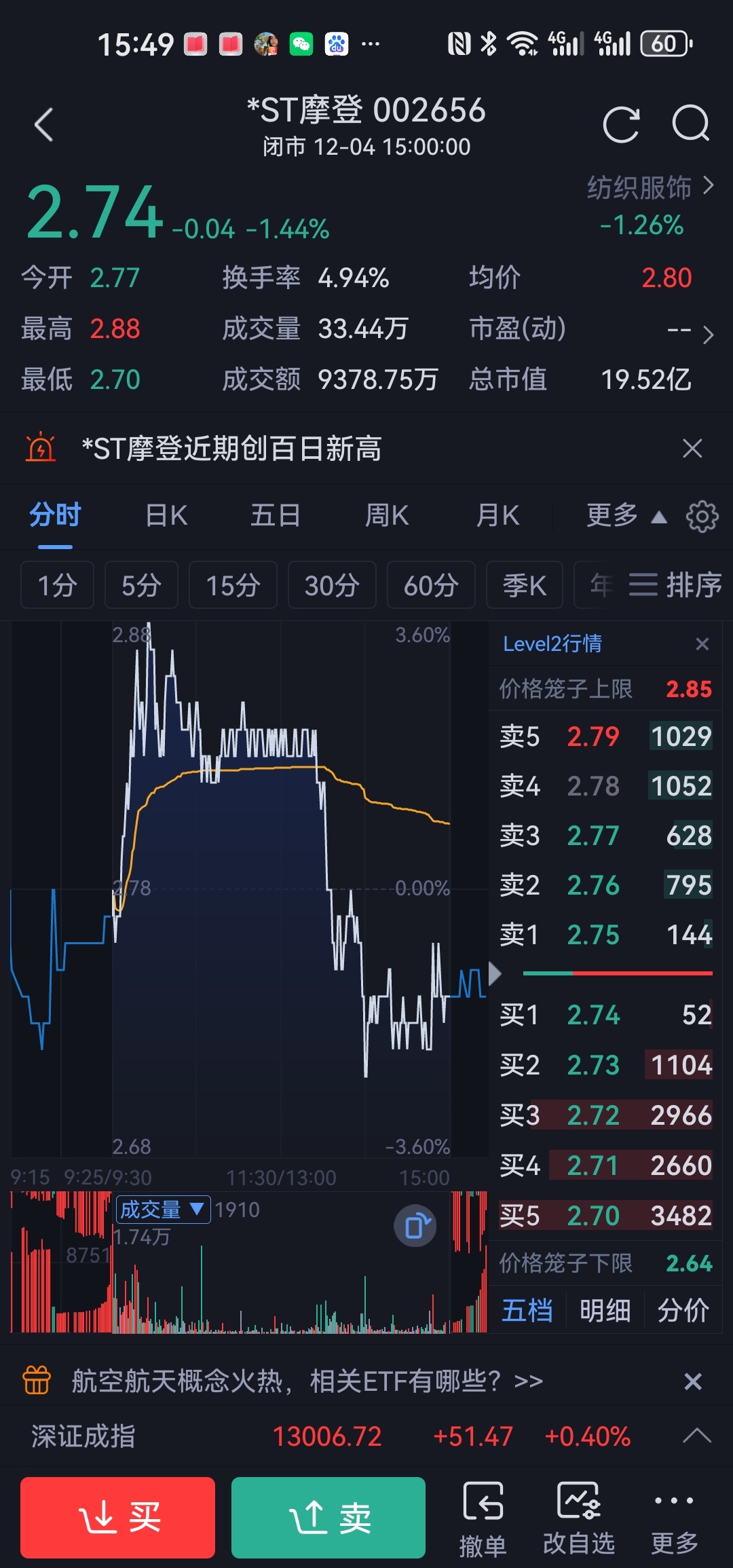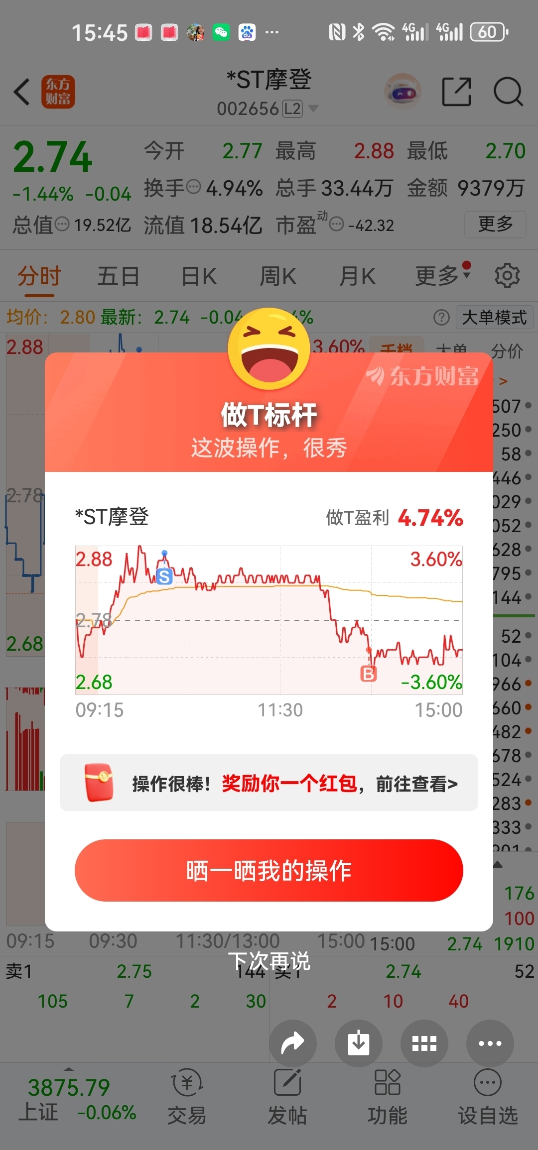今天主力最高价2.88,最低价2.70。我2.87抛,2.71买。除了主力,还有哪个小散是我这样玩的