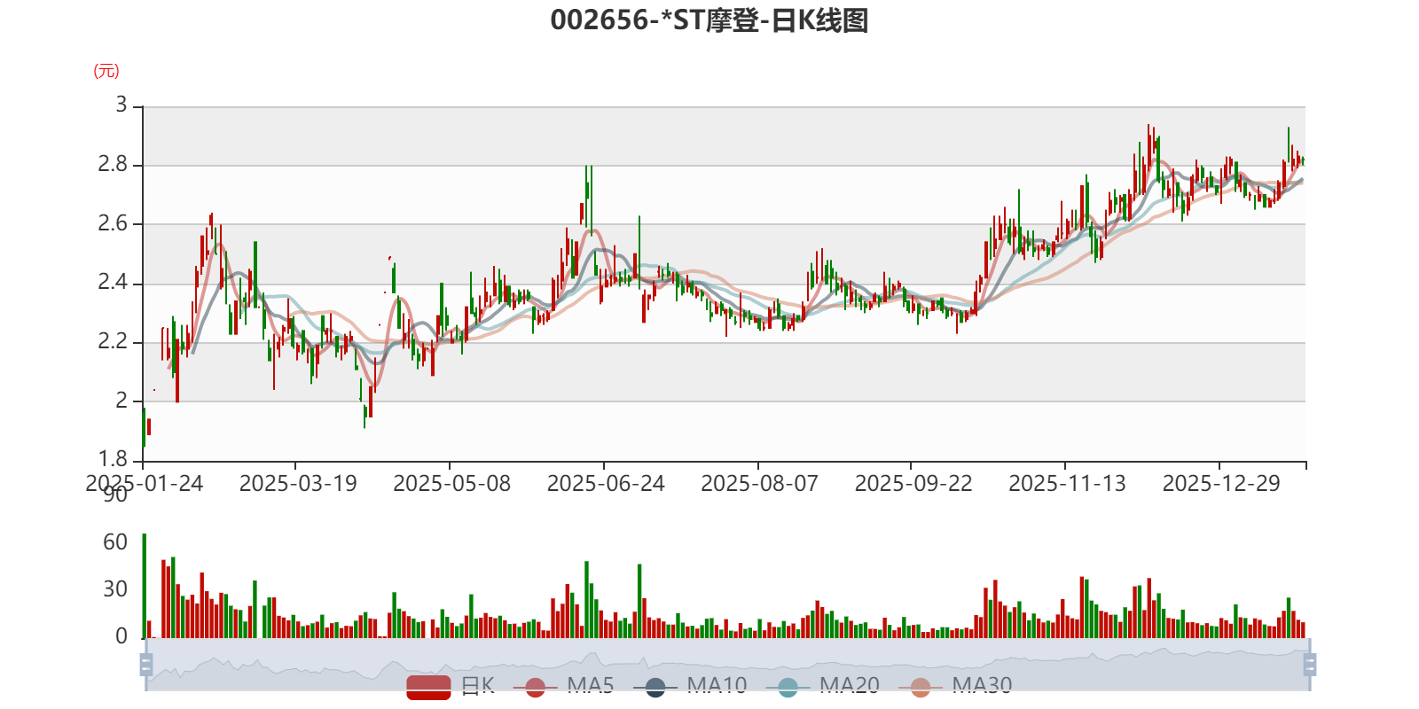 中证智能财讯 *ST摩登(002656)1月23日晚间披露2025年度业绩预告,预计2025年实现营业收入4.84亿元至7.26亿元;归母净利润亏损3728万元至7456万元,上年同期亏损6209.83万元;扣非净利润亏损4888万元至9776万元,上年同期亏损5799.11万元;基本每股收益-0.0523元/股至-0.1046元/股。以最新收盘价计算,市净率(LF)约4.73倍,市销率(TTM)约3.32倍。