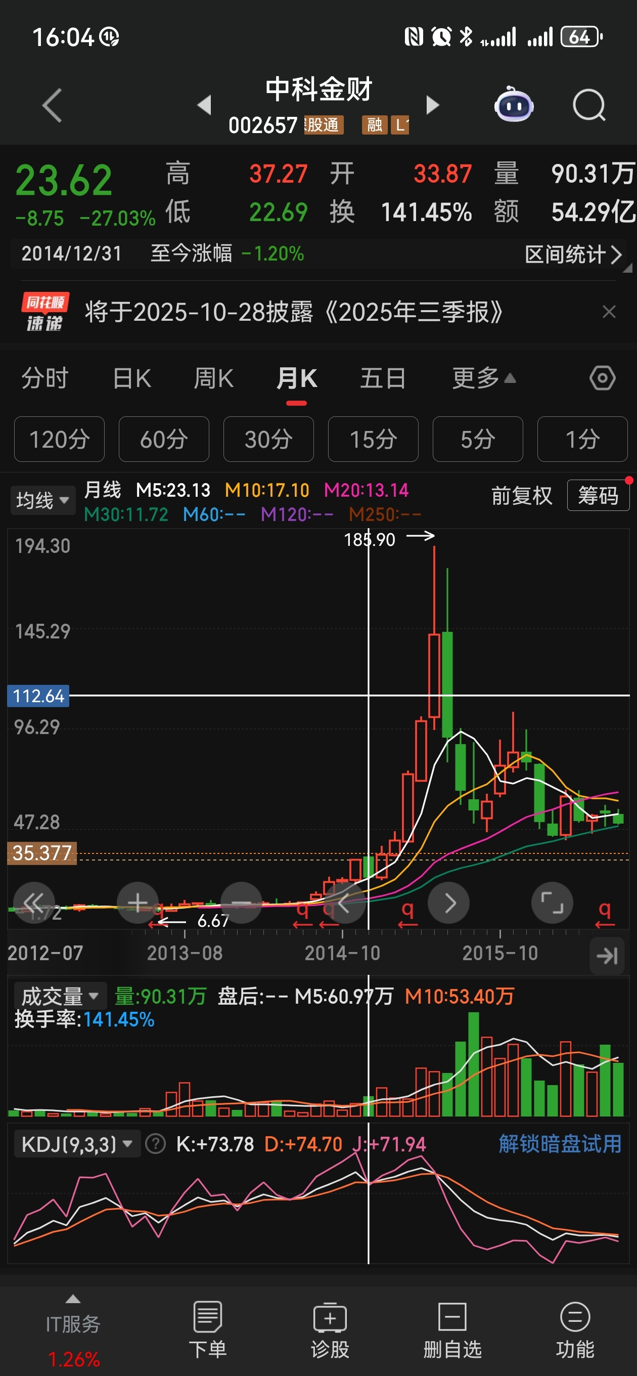 $中科金财(SZ002657)$ 历史总是惊人的相似,上一波牛市也是遇到一个月调整27个点,而后翻几倍。这次呢?9月也是调整了29个点。这个月要大涨也是这几天了。