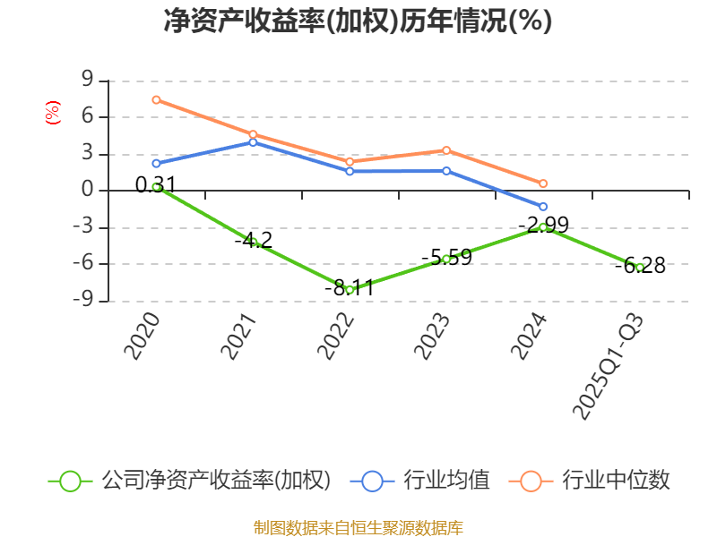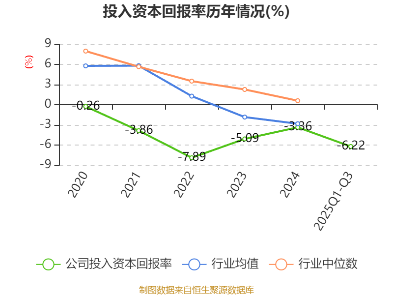 盈利能力方面, 2025年前三季度公司加权平均净资产收益率为-6.28%,同比下降2.03个百分点。公司2025年前三季度投入资本回报率为-6.22%,较上年同期下降1.68个百分点。