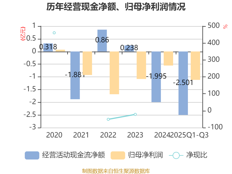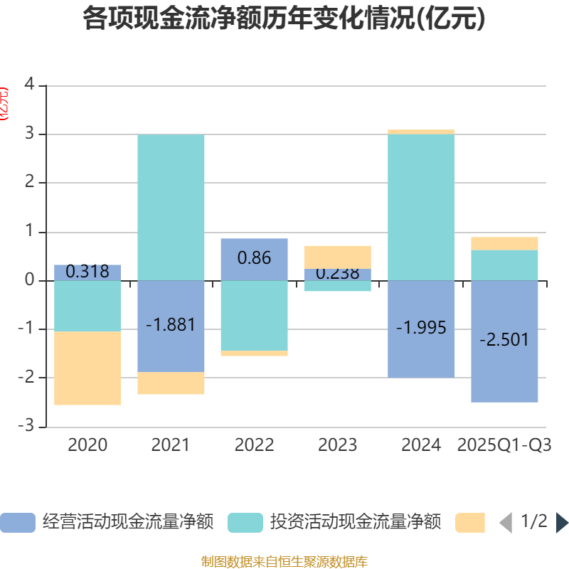 2025年前三季度,公司经营活动现金流净额为-2.5亿元,同比减少8049.25万元;筹资活动现金流净额2647.45万元,同比增加8081.37万元;投资活动现金流净额6252万元,上年同期为2.32亿元。