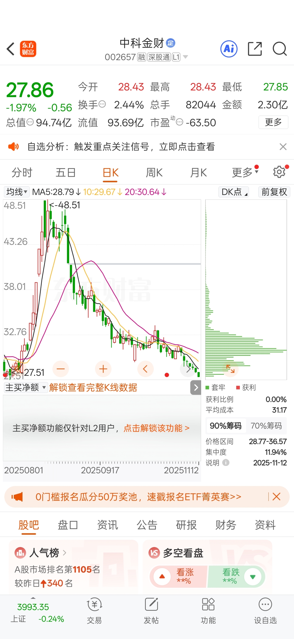 $中科金财(SZ002657)$ 获利比例居然是零,真的是长见识了就没人获利的