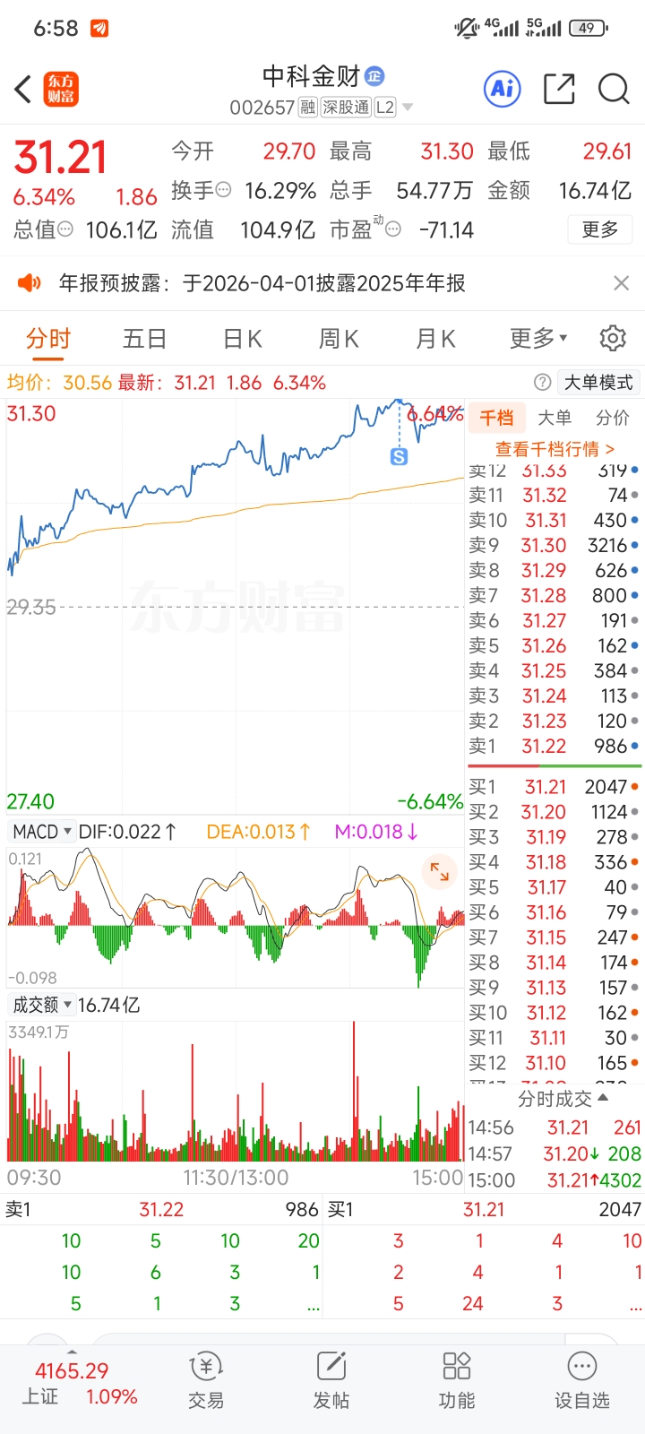 $中科金财(SZ002657)$ 拿不住,前天买的,今天卖了
