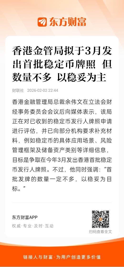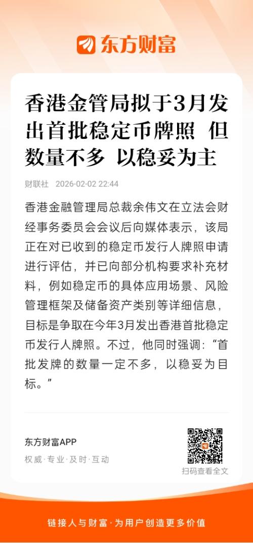 香港金融管理局总裁余伟文在立法会财经事务委员会会议后向媒体表示,该局正在对已收到的稳定币发行人牌照申请进行评估,并已向部分机构要求补充材料,例如稳定币的具体应用场景、风险管理框架及储备资产类别等详细信息,目标是争取在今年3月发出香港首批稳定币发行人牌照。不过,他同时强调:“首批发牌的数量一定不多,以稳妥为目标。”