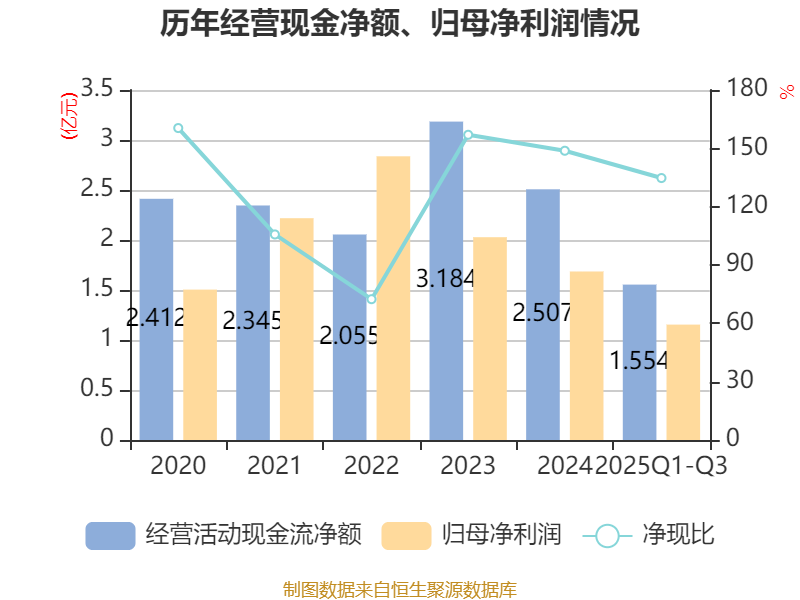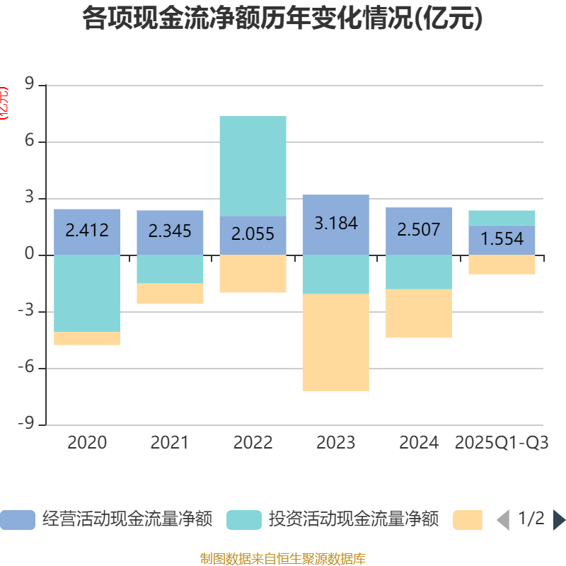 2025年前三季度,公司经营活动现金流净额为1.55亿元,同比增长8.77%;筹资活动现金流净额-1.04亿元,同比增加1.54亿元;投资活动现金流净额7899.12万元,上年同期为-4866.59万元。