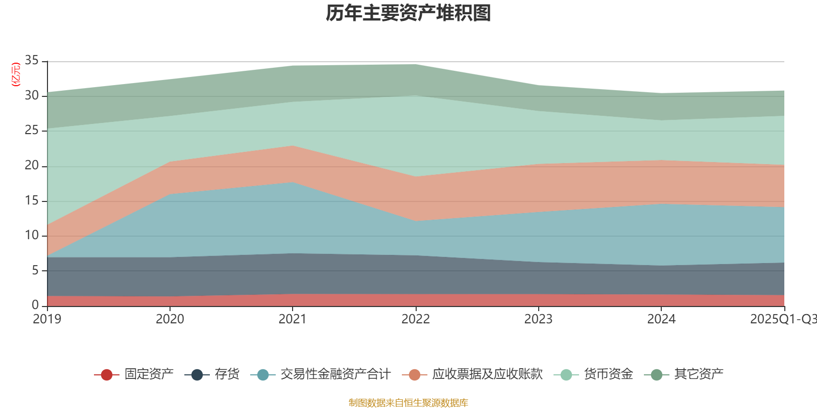 资产重大变化方面,截至2025年三季度末,公司货币资金较上年末增加23.45%,占公司总资产比重上升4.12个百分点;交易性金融资产合计较上年末减少9.97%,占公司总资产比重下降3.19个百分点;存货较上年末增加11.98%,占公司总资产比重上升1.46个百分点;应收票据及应收账款较上年末减少3.5%,占公司总资产比重下降0.95个百分点。