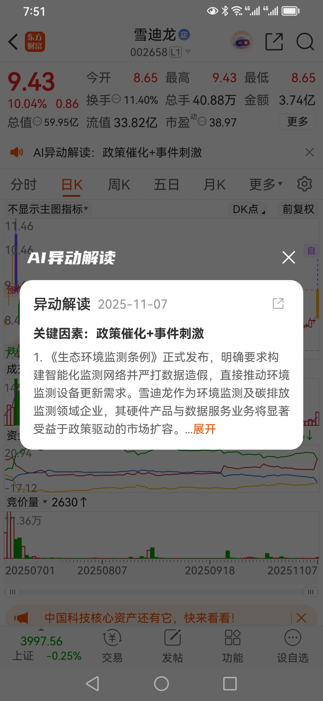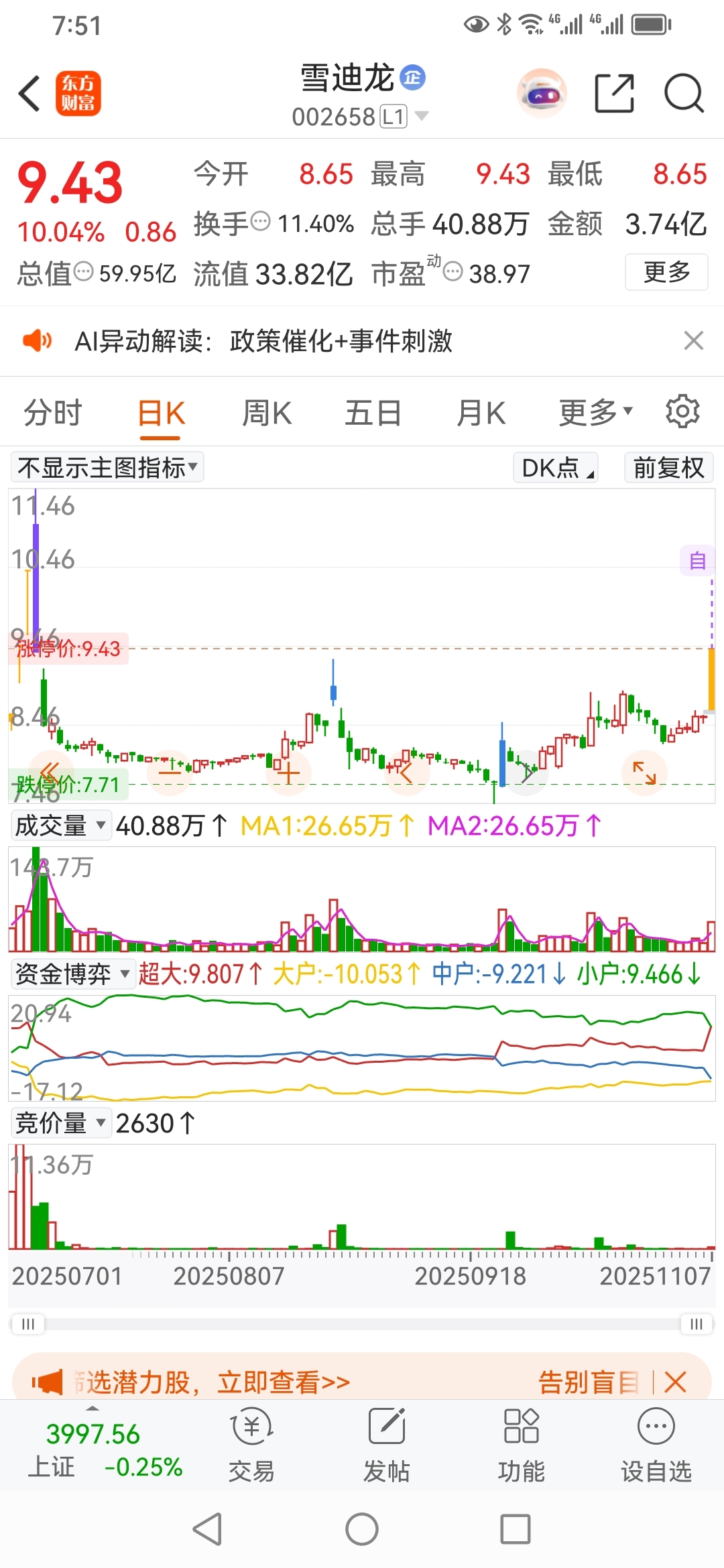 方军,半仓打板成功,雪迪龙,环保,首板,9.43元。