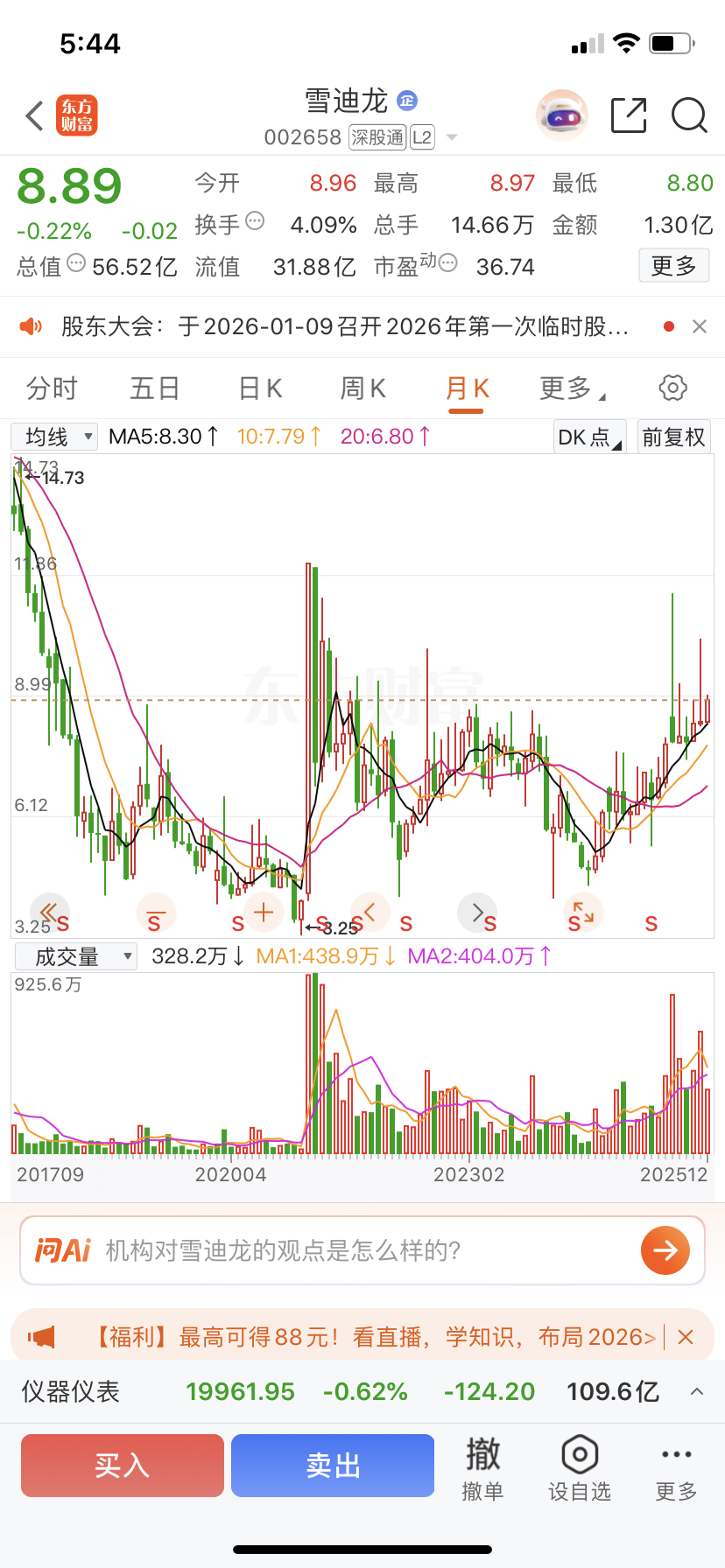 $雪迪龙(SZ002658)$ 18年开始,冲过8.89只有三两次,大多数时间都在5块多