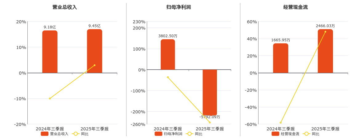 公司营业总收入为9.45亿元,较去年同报告期营业总收入增加2707.32万元,同比较去年同期上涨2.95%。归母净利润为-5792.09万元,较去年同报告期归母净利润减少9594.59万元,同比较去年同期下降252.32%。经营活动现金净流入为2466.03万元,较去年同报告期经营活动现金净流入增加800.07万元,同比较去年同期上涨48.02%。